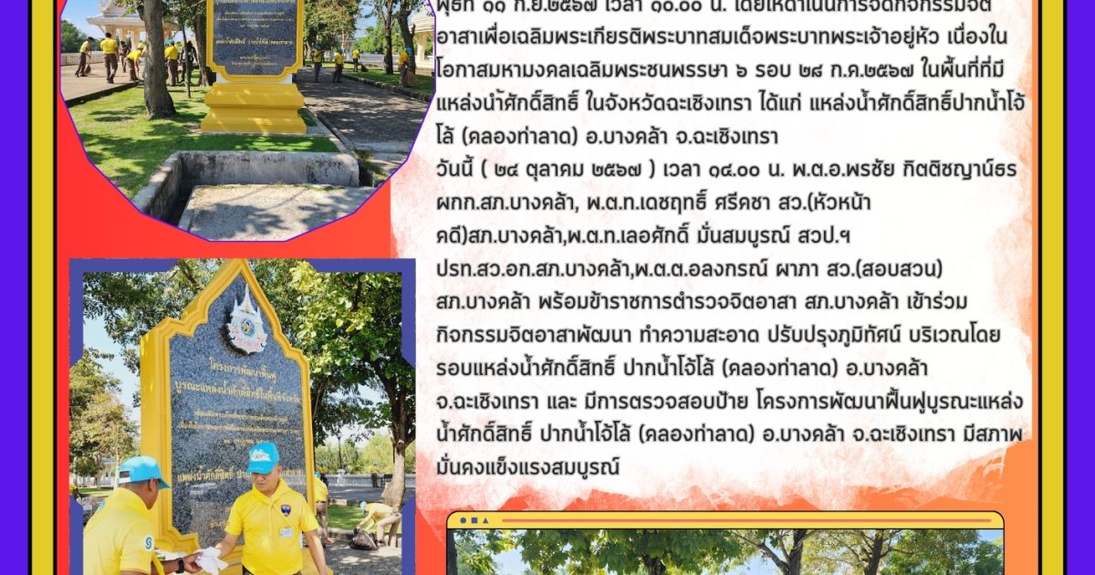 วันนี้ ( ๒๔ ตุลาคม ๒๕๖๗ ) เวลา ๑๔.๐๐ น. พ.ต.อ.พรชัย กิตติชญาน์ธร ผกก.สภ.บางคล้า, พ.ต.ท.เดชฤทธิ์ ศรีคชา สว.(หัวหน้าคดี)สภ.บางคล้า,พ.ต.ท.เลอศักดิ์ มั่นสมบูรณ์ สวป.ฯ ปรท.สว.อก.สภ.บางคล้า,พ.ต.ต.อลงกรณ์ ผาภา สว.(สอบสวน) สภ.บางคล้า พร้อมข้าราชการตำรวจจิตอาสา สภ.บางคล้า เข้าร่วมกิจกรรมจิตอาสาพัฒนา ทำความสะอาด ปรับปรุงภูมิทัศน์ บริเวณโดยรอบแหล่งน้ำศักดิ์สิทธิ์ ปากน้ำโจ้โล้ (คลองท่าลาด) อ.บางคล้า จ.ฉะเชิงเทรา และ มีการตรวจสอบป้าย โครงการพัฒนาฟื้นฟูบูรณะแหล่งน้ำศักดิ์สิทธิ์ ปากน้ำโจ้โล้ (คลองท่าลาด) อ.บางคล้า จ.ฉะเชิงเทรา มีสภาพมั่นคงแข็งแรงสมบูรณ์