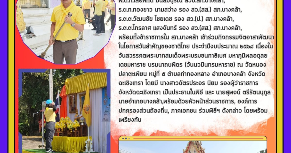 วันนี้ (๑๑ ต.ค.๒๕๖๗) เวลา ๐๙.๐๐ น. พ.ต.อ.พรชัย กิตติชญาน์ธร ผกก.สภ.บางคล้า,พ.ต.ท.เลอศักดิ์ มั่นสมบูรณ์ สวป.สภ.บางคล้า,ร.ต.ท.ทองขาว นามสว่าง รอง สว.(สส.) สภ.บางคล้า,ร.ต.ต.วัฒนชัย ไชยเดช รอง สว.(ป.) สภ.บางคล้า,ร.ต.ต.ไกรลาศ แสงจันทร์ รอง สว.(สส.) สภ.บางคล้า,พร้อมทั้งข้าราชการใน สภ.บางคล้า เข้าร่วมกิจกรรมจิตอาสาพัฒนา ในโอกาสวันสำคัญของชาติไทย ประจำปีงบประมาณ ๒๕๖๘ เนื่องในวันสวรรคตพระบาทสมเด็จพระบรมชนกาธิเบศ มหาภูมิพลอดุลยเดชมหาราช บรมนาถบพิตร (วันนวมินทรมหาราช) ณ วัดหนองปลาตะเพียน หมู่ที่ ๕ ตำบลท่าทองหลาง อำเภอบางคล้า จังหวัดฉะเชิงเทรา โดยมี นางสาวฉัตรประอร นิยม รองผู้ว่าราชการจังหวัดฉะเชิงเทรา เป็นประธานในพิธี และ นายสุพจน์ ตรีรัตนนุกูล นายอำเภอบางคล้า,พร้อมด้วยหัวหน้าส่วนราชการ, องค์การปกครองส่วนถ้องถิ่น, ภาคเอกชน ร่วมพิธีฯ ดังกล่าว โดยพร้อมเพรียงกัน