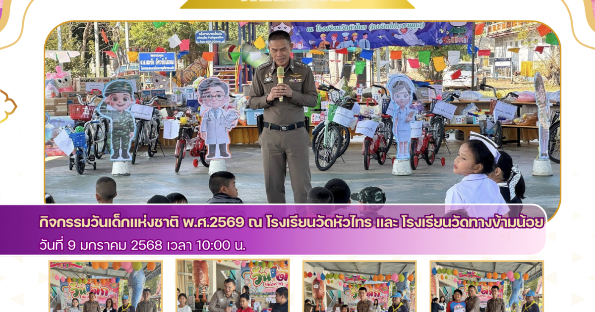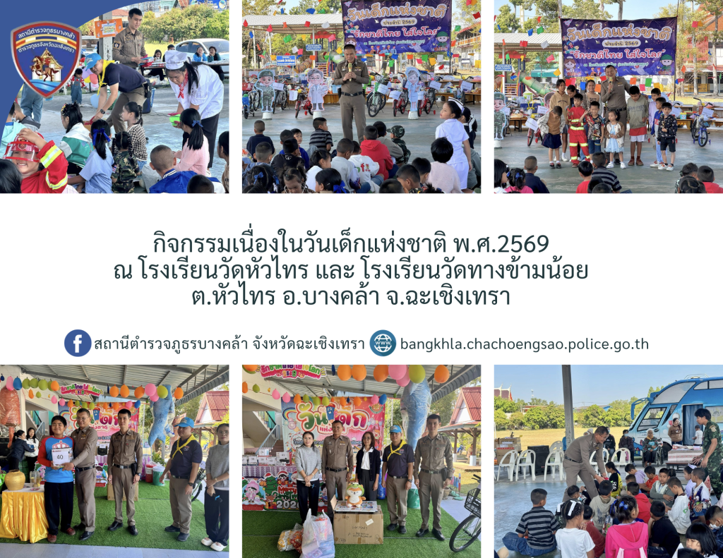 ตำรวจ สภ.บางคล้า ร่วมกิจกรรมวันเด็กแห่งชาติ พ.ศ.2569 ณ โรงเรียนวัดหัวไทร และ โรงเรียนวัดทางข้ามน้อย 9 มกราคม 2026 โดย admbangkhla / ข่าวกิจกรรม,ข่าวภารกิจผู้บังคับบัญชา,ผลงานแต่ละงาน,งานอำนวยการ,ผลงานแต่ละงาน Post Views: 35 วันศุกร์ที่ 9 มกราคม 2568 เวลา 10.00 น. - พ.ต.อ.สุมิตร พรมตอง ผกก.สภ.บางคล้า - พ.ต.ท.เลอศักดิ์ มั่นสมบูรณ์ สว.อก.สภ.บางคล้า พร้อมข้าราชการตำรวจ สภ.บางคล้า ร่วมกิจกรรมเนื่องในวันเด็กแห่งชาติ พ.ศ.2569 ณ โรงเรียนวัดหัวไทร และ โรงเรียนวัดทางข้ามน้อย ต.หัวไทร อ.บางคล้า จ.ฉะเชิงเทรา