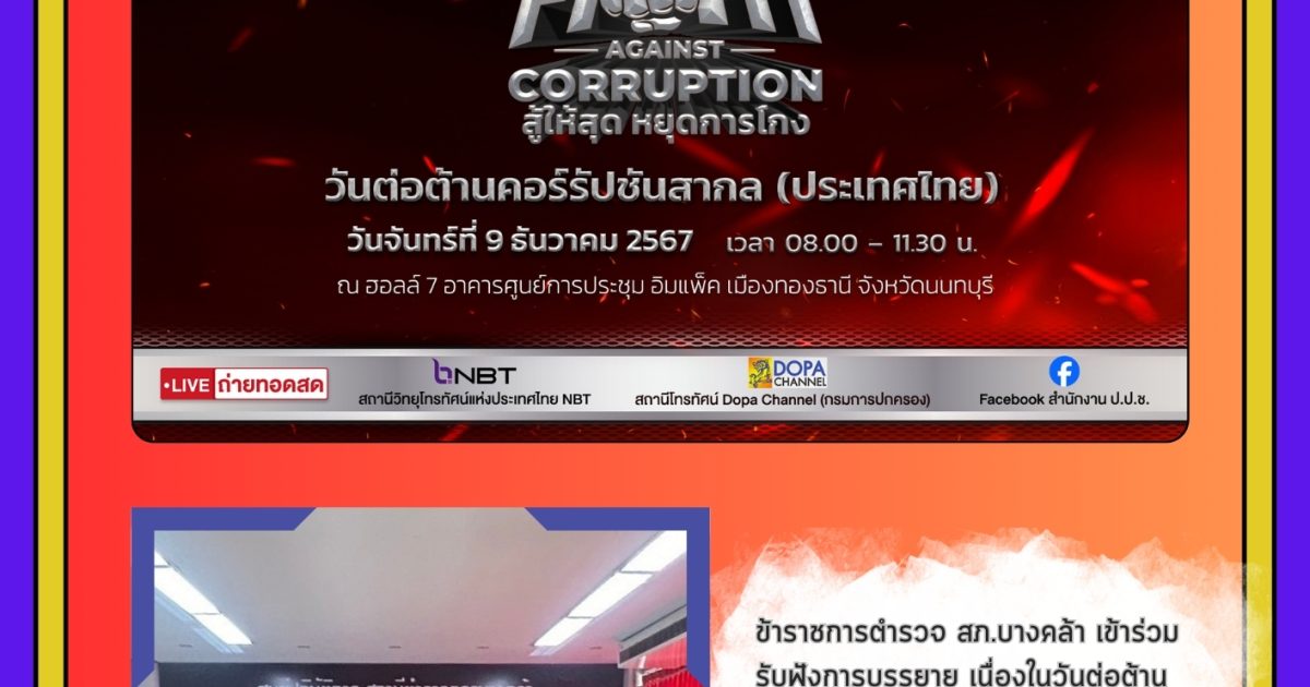 ข้าราชการตำรวจ สภ.บางคล้า เข้าร่วมรับฟังการบรรยาย เนื่องในวันต่อต้านคอร์รัปชันสากล (ประเทศไทย) ในวันจันทร์ที่ 9 ธันวาคม 2567 เวลา 08.00 – 11.30 น. ผ่านทาง Facebook ของสำนักงานคณะกรรมการป้องกันและปราบปรามการทุจริตแห่งชาติ ณ ห้องประชุมชั้น 3 สภ.บางคล้า