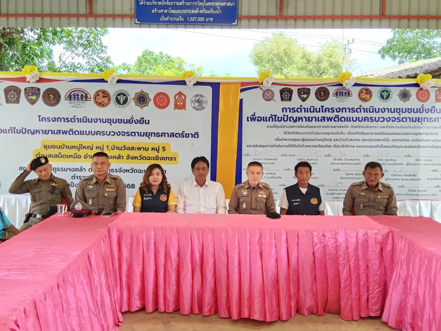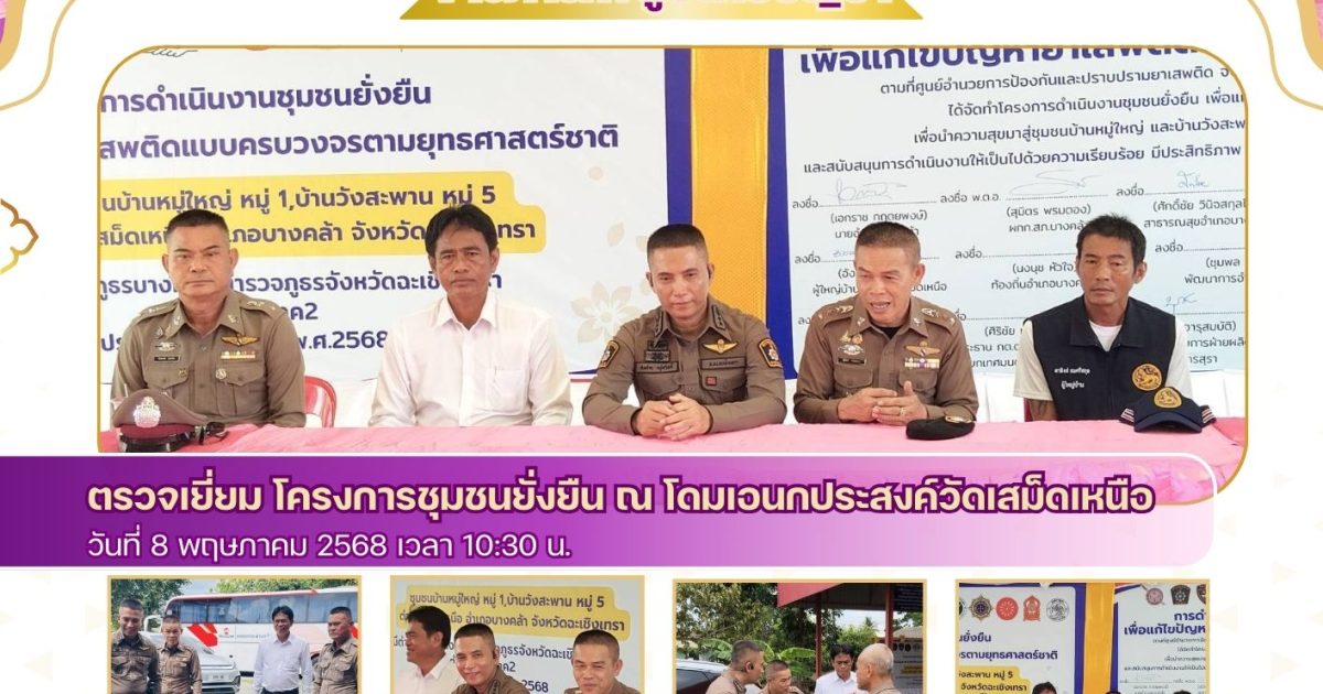 พ.ต.อ.สมชาย อยู่สวัสดิ์ รอง ผบก.ภ.จว.ฉะเชิงเทรา ได้เดินทางมาตรวจเยี่ยม โครงการชุมชนยั่งยืน ณ โดมเอนกประสงค์วัดเสม็ดเหนือ ม.1 ต.เสม็ดเหนือ อ.บางคล้า จ.ฉะเชิงเทรา พบ พ.ต.อ.สุมิตร พรมตอง ผกก.สภ.บางคล้า, พ.ต.ท.จิระพงษ์ รอดเงิน รอง.ป.สภ.บางคล้า, พ.ต.ท.ชูศักดิ์ เอี่ยมนิรันดร์ สวป.สภ.บางคล้า, พ.ต.ท.เลอศักดิ์ มั่นสมบูรณ์ สว.อก.สภ.บางคล้า พร้อมข้าราชการตำรวจชุดปฏิบัติการณ์ชุมชนยั่งยืน สภ.บางคล้า, จนท.ฝ่ายปกครอง อ.บางคล้า, คณะกรรมการหมู่บ้าน ต.เสม็ดเหนือ, ผู้ใหญ่บ้าน, จนท.อสม.ม.1,ม.5 ต.เสม็ดเหนือ อยู่ปฏิบัติหน้าที่ รายงานเหตุการณ์ปกติ จึงได้สั่งการปฏิบัติหน้าที่นโยบายดังกล่าว