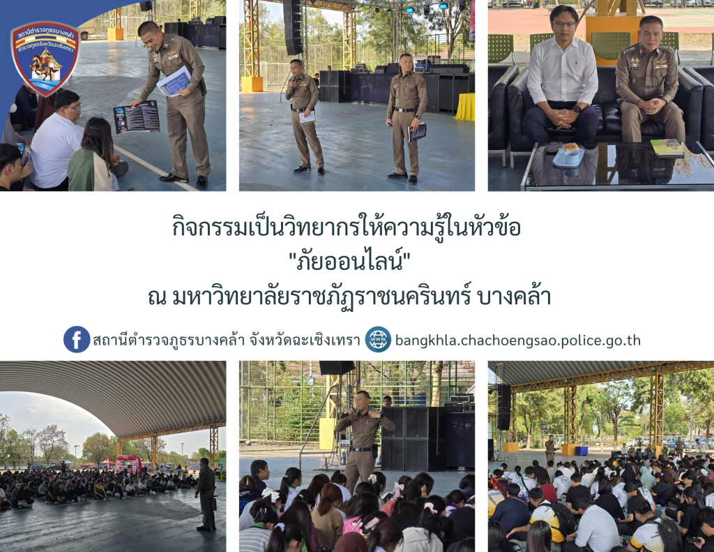 ตำรวจ สภ.บางคล้า ร่วมกิจกรรมเป็นวิทยากรให้ความรู้ในหัวข้อ “ภัยออนไลน์” ณ มหาวิทยาลัยราชภัฏราชนครินทร์ บางคล้า 14 มกราคม 2026 โดย admbangkhla / ข่าวกิจกรรม,ข่าวภารกิจผู้บังคับบัญชา,ผลงานแต่ละงาน,งานป้องกันปราบปราม,ผลงานแต่ละงาน Post Views: 31 วันนี้ ที่ 14 ม.ค. 69 เวลา 13.00 น. พ.ต.อ.สุมิตร พรมตอง ผกก.สภ.บางคล้า พร้อมข้าราชการตำรวจ สภ.บางคล้า ร่วมกิจกรรมเป็นวิทยากรให้ความรู้ในหัวข้อ "ภัยออนไลน์" ณ มหาวิทยาลัยราชภัฏราชนครินทร์ บางคล้า