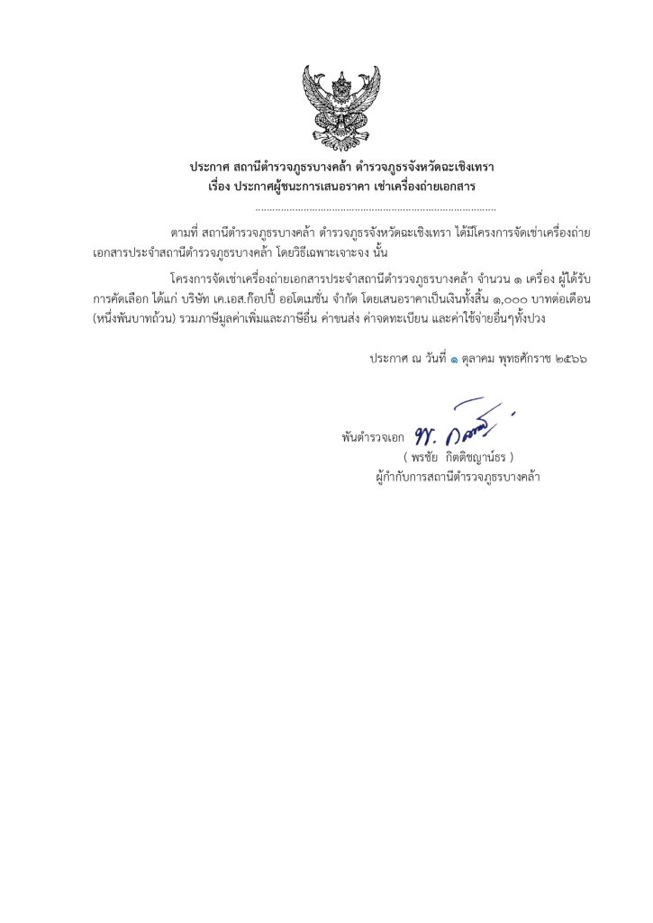ประกาศผู้ชนะการเสนอราคา เช่าเครื่องถ่ายเอกสารประจำ สภ. โดยวิธีเฉพาะเจาะจง 1 ตุลาคม 2023 โดย admbangkhla / ข่าวจัดซื้อจัดจ้าง,ข่าวจัดซื้อจัดจ้าง,งานการเงินและพัสดุ Post Views: 27