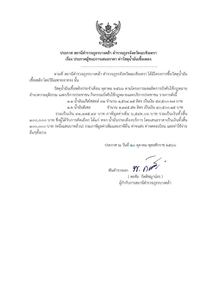 ประกาศผู้ชนะการเสนอราคา ค่าพัสดุน้ำมันเชื้อเพลิง โดยวิธีเฉพาะเจาะจง 20 ตุลาคม 2023 โดย admbangkhla / ข่าวจัดซื้อจัดจ้าง,ข่าวจัดซื้อจัดจ้าง,งานการเงินและพัสดุ Post Views: 33