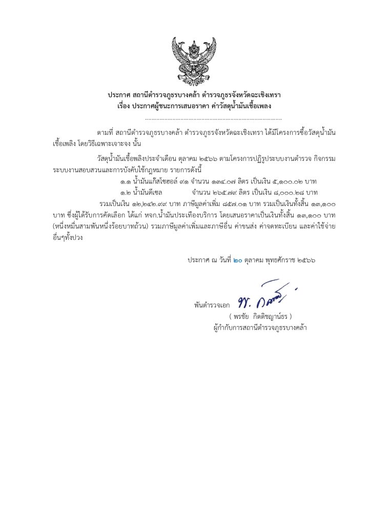 ประกาศผู้ชนะการเสนอราคา ค่าพัสดุน้ำมันเชื้อเพลิง โดยวิธีเฉพาะเจาะจง 20 ตุลาคม 2023 โดย admbangkhla / ข่าวจัดซื้อจัดจ้าง,ข่าวจัดซื้อจัดจ้าง,งานการเงินและพัสดุ Post Views: 32