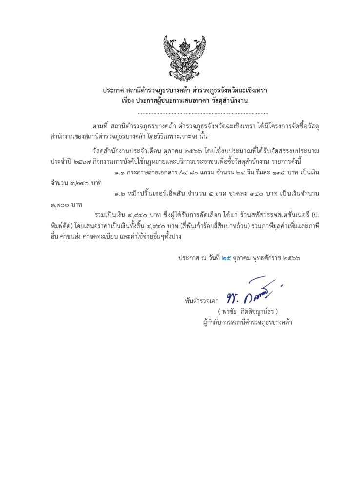 ประกาศผู้ชนะการเสนอราคา ค่าพัสดุสำนักงาน โดยวิธีเฉพาะเจาะจง 25 ตุลาคม 2023 โดย admbangkhla / ข่าวจัดซื้อจัดจ้าง,ข่าวจัดซื้อจัดจ้าง,งานการเงินและพัสดุ Post Views: 34