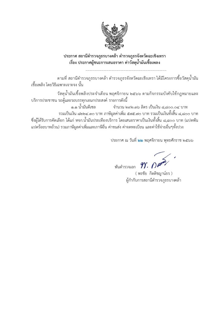 ประกาศผู้ชนะการเสนอราคา ค่าพัสดุน้ำมันเชื้อเพลิง โดยวิธีเฉพาะเจาะจง 22 พฤศจิกายน 2023 โดย admbangkhla / ข่าวจัดซื้อจัดจ้าง,ข่าวจัดซื้อจัดจ้าง,งานการเงินและพัสดุ Post Views: 36