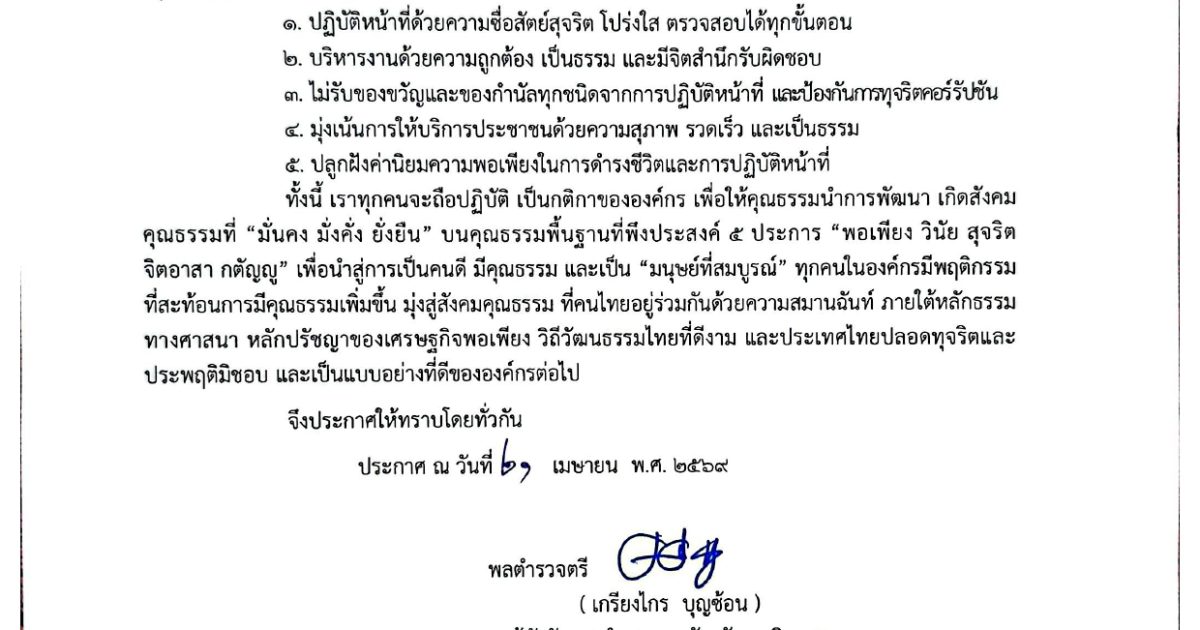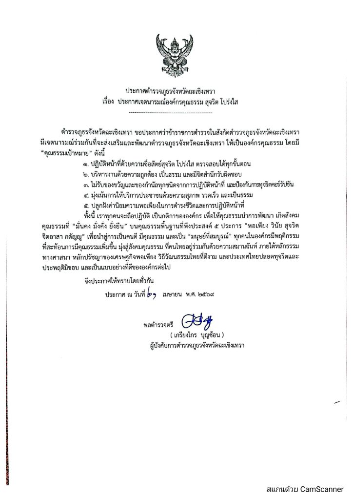 ประกาศเจตนารมณ์องค์กรคุณธรรม สุจริต โปร่งใส ตำรวจภูธรจังหวัดฉะเชิงเทรา 22 เมษายน 2026 โดย admbangkhla / ข่าวประชาสัมพันธ์,ข่าวประชาสัมพันธ์,ข่าวฝากประชาสัมพันธ์,ประชาสัมพันธ์(ITA) Post Views: 4