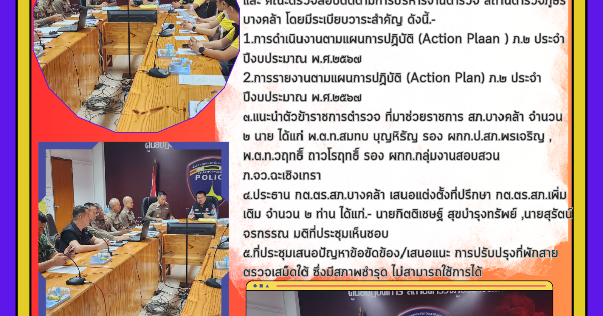 วันนี้ (๒๑ พฤษภาคม ๒๕๖๗) เวลา ๑๓.๓๐ น.นายสุรชัย โชคชัยอำนวยพร ประธาน กต.ตร.สภ.บางคล้า, พ.ต.อ.พรชัย กิตติชญาน์ ผกก.สภ.บางคล้า,พ.ต.ท.เอกภพ ธรรมาธิกุล รอง ผกก.สส.สภ.บางคล้า พ.ต.ท.เลอศักดิ์ มั่นสมบูรณ์ สวป.สภ.บางคล้า, และ คณะตรวจสอบติดตามการบริหารงานตำรวจ สถานีตำรวจภูธรบางคล้า โดยมีระเบียบวาระสำคัญ ดังนี้.-
