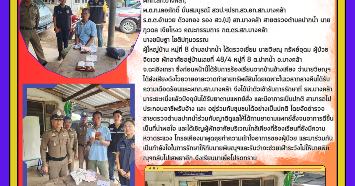 ผกก.สภ.บางคล้า, พ.ต.ท.เลอศักดิ์ มั่นสมบูรณ์ สวป.ฯปรท.สว.อก.สภ.บางคล้า ร.ต.ต.อำนวย ด้วงทอง รอง สว.(ป) สภ.บางคล้า สายตรวจตำบลปากน้ำ นายภูวดล เจียโหงว คณะกรรมการ กต.ตร.สภ.บางคล้า นางขนิษฐา โชติปทุมวรรณ ผู้ใหญ่บ้าน หมู่ที่ 8 ตำบลปากน้ำ ได้ตรวจเยี่ยม นายวิษณุ ทรัพย์อุดม ผู้ป่วยจิตเวช พักอาศัยอยู่บ้านเลขที่ 48/4 หมู่ที่ 8 ต.ปากน้ำ อ.บางคล้า จ.ฉะเชิงเทรา ซึ่งก่อนหน้านี้ได้รับการร้องเรียนจากบ้านข้างเคียง ว่านายวิษณุฯได้ส่งเสียงดังโวยวายอาละวาดทำลายทรัพย์สินโดยเฉพาะในเวลากลางคืนได้รับความเดือดร้อนและผกก.สภ.บางคล้า จึงได้นำตัวเข้ารับการรักษาที่ รพ.บางคล้ามาระยะหนึ่งแล้วปัจจุบันได้รับยาตามแพทย์สั่ง และมีอาการเป็นปกติ สามารถไปประกอบอาชีพรับจ้าง และ อยู่ร่วมกับชุมชนได้อย่างเป็นปกติ โดยจัดตำรวจสายตรวจตำบลปากนำ้ร่วมกับญาติดูแลให้ได้ทานยาตามแพทย์สั่งจนอาการดีขึ้นเป็นที่น่าพอใจ และได้เชิญผู้พักอาศัยบริเวณใกล้เคียงที่ร้องเรียนที่ยังมีความหวาดระแวง โกรธเคืองมาพูดคุยทำความเข้าใจอาการของผู้ป่วย และมาร่วมกันเป็นกำลังใจในการรักษาให้กับนายพิษณุฯและรับว่าจะช่วยเฝ้าระวังไม่ให้นายพิษณุฯกลับไปเสพยาอีก