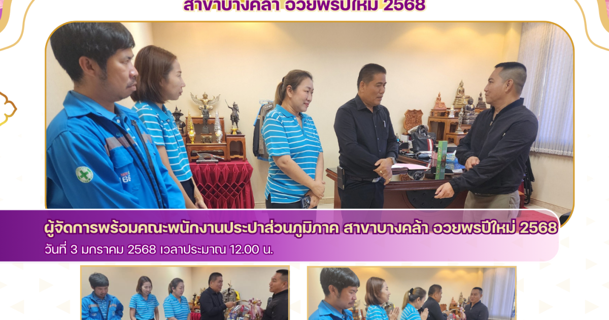 ผู้จัดการส่วนภูมิภาค สาขาบางคล้า พร้อมคณะพนักงานประปาส่วนภูมิภาค สาขาบางคล้า ได้ร่วมกันอวยพร และ ขอพรเนื่องในวาระดิถีปีใหม่ 2568 จาก พ.ต.อ.พรชัย กิตติชญาน์ธร ผกก.สภ.บางคล้า 3 มกราคม 2025 โดย admbangkhla / ข่าวกิจกรรม,ข่าวภารกิจผู้บังคับบัญชา Post Views: 36 วันนี้( 3 มกราคม 2568 ) เวลา 12.00 น. นายจินดา วงศ์ประยูรศรี ผู้จัดการส่วนภูมิภาค สาขาบางคล้า พร้อมคณะพนักงานประปาส่วนภูมิภาค สาขาบางคล้า ได้ร่วมกันอวยพร และ ขอพรเนื่องในวาระดิถีปีใหม่ 2568 จาก พ.ต.อ.พรชัย กิตติชญาน์ธร ผกก.สภ.บางคล้า