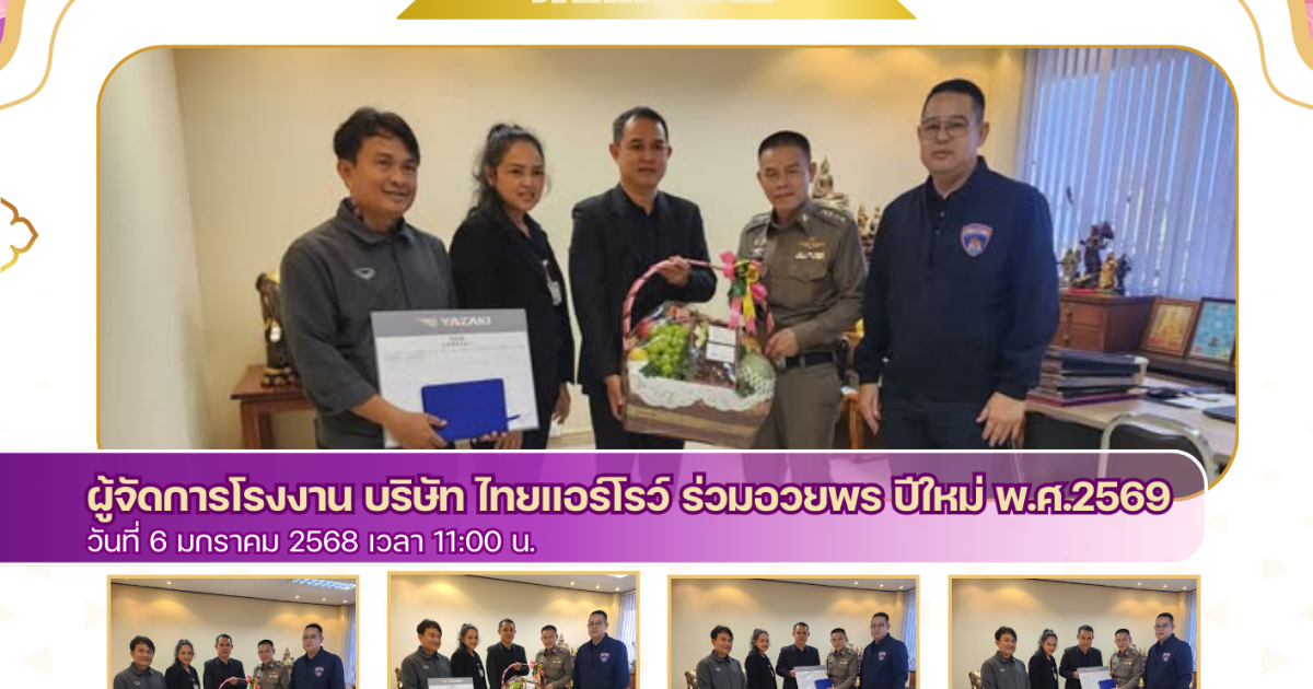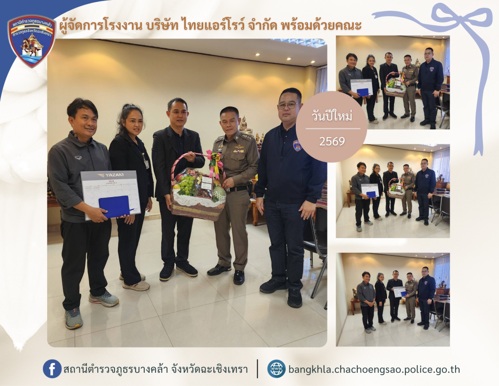 คุณนันทพล ผลคำ,คุณสุกัญญา อร่ามวงษ์,คุณพงษ์สุระ สถาพร ผู้จัดการโรงงาน บริษัท ไทยแอร์โรว์ จำกัด พร้อมด้วยคณะ ได้เข้าพบ พ.ต.อ.สุมิตร พรมตอง ผกก.สภ.บางคล้า,พ.ต.ท.จิระพงษ์ รอดเงิน รอง ผกก.ป.สภ.บางคล้า,พ.ต.ท.ธงชัย วงษ์บุดดา รอง ผกก.(สอบสวน) สภ.บางคล้า , พ.ต.ท.ไพรัช มณีพันธ์ รอง ผกก.สส.สภ.บางคล้า , พ.ต.ท.พชรธัช สมานกิตติธร สว.สส.สภ.บางคล้า ร่วมอวยพรและขอพร เนื่องในปีใหม่ พ.ศ.2569
