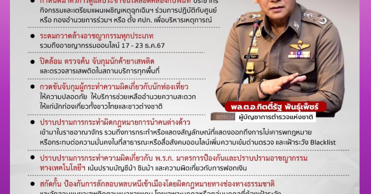 พล.ต.อ.กิตติ์รัฐ พันธุ์เพ็ชร์ ผู้บัญชาการตำรวจแห่งชาติ สั่งการตำรวจทั่วประเทศ กำชับป้องกัน ปราบปรามอาชญากรรม เทศกาลคริสต์มาส – ปีใหม่ 2568