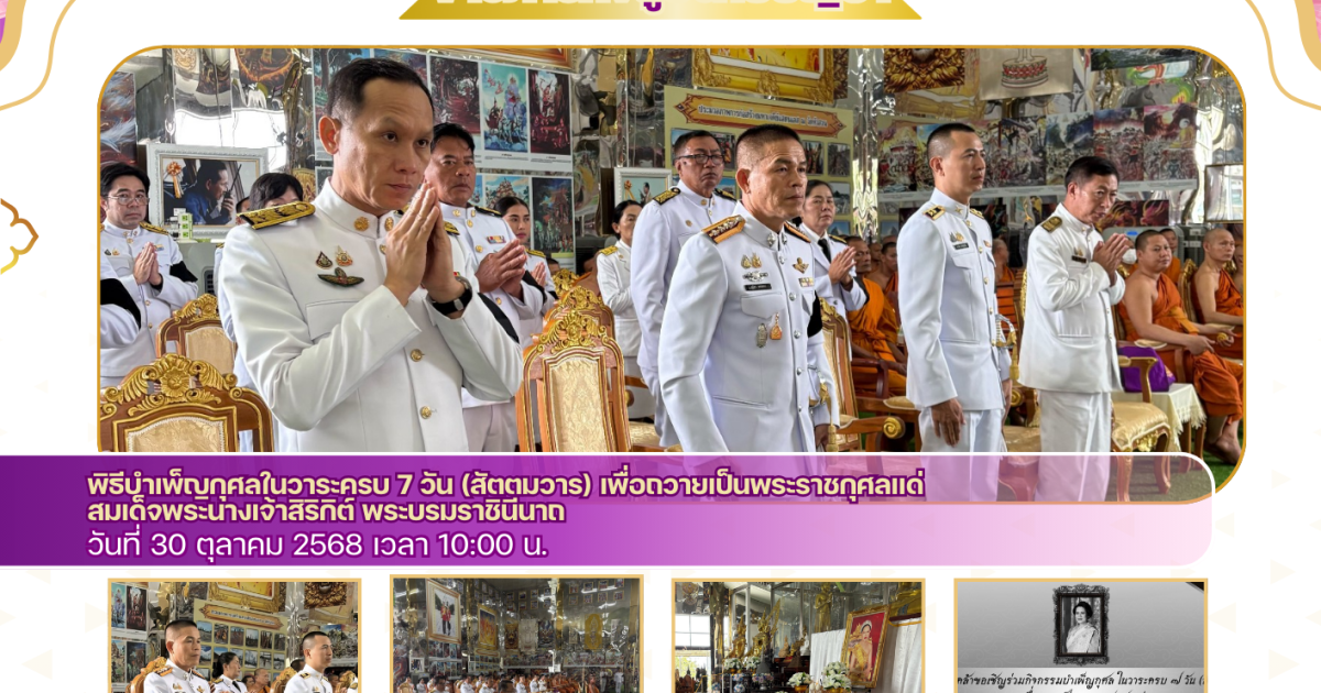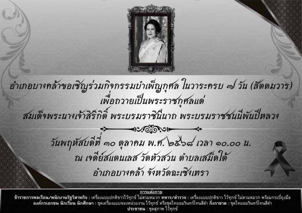 พิธีบำเพ็ญกุศลในวาระครบ 7 วัน (สัตตมวาร) เพื่อถวายเป็นพระราชกุศลแด่ สมเด็จพระนางเจ้าสิริกิต์ พระบรมราชินีนาถ 30 ตุลาคม 2025 โดย admbangkhla / ข่าวกิจกรรม,ข่าวภารกิจผู้บังคับบัญชา Post Views: 225 วันนี้ (๓๐ ต.ค.๒๕๖๘) เวลา ๑๐.๐๐ น. พ.ต.อ.สุมิตร พรมตอง ผกก.สภ.บางคล้า, และข้าราชการตำรวจ สภ.บางคล้า ร่วมพิธีบำเพ็ญกุศลในวาระครบ ๗ วัน(สัตตมวาร) เพื่อถวายเป็นพระราชกุศลแด่สมเด็จพระนางเจ้าสิริกิต์ พระบรมราชินีนาถ พระบรมราชชนนีพันปีหลวง ณ วัดหัวสวน ต.เสม็ดใต้ อ.บางคล้า จ.ฉะเชิงเทรา โดยมี นายเอกราช กฤตยพงษ์ นายอำเภอบางคล้า เป็นประธานในพิธี, พร้อมด้วยหัวหน้าส่วนราชการ/องค์การปกครองส่วนถ้องถิ่น/ภาคเอกชน ร่วมพิธีฯ ดังกล่าว โดยพร้อมเพรียงกัน