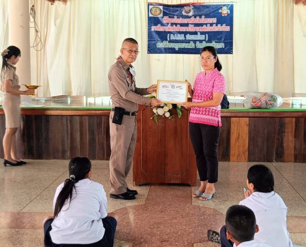เมื่อวันที่ 19 มี.ค.67 เวลา 13.30-14.30น. ภายใต้การอำนวยการ ของ พ.ต.อ.พรชัย กิตติชญาน์ธร ผกก.สภ.บางคล้ามอบหมายครูตำรวจD.A.R.E.ร่วมกับโรงเรียนวัดบางกระเจ็ด จัดพิธีมอบใบประกาศนียบัตรและปิดโครงการการศึกษาเพื่อต่อต้านการใช้ยาเสพติด (D.A.R.E.ประเทศไทย )