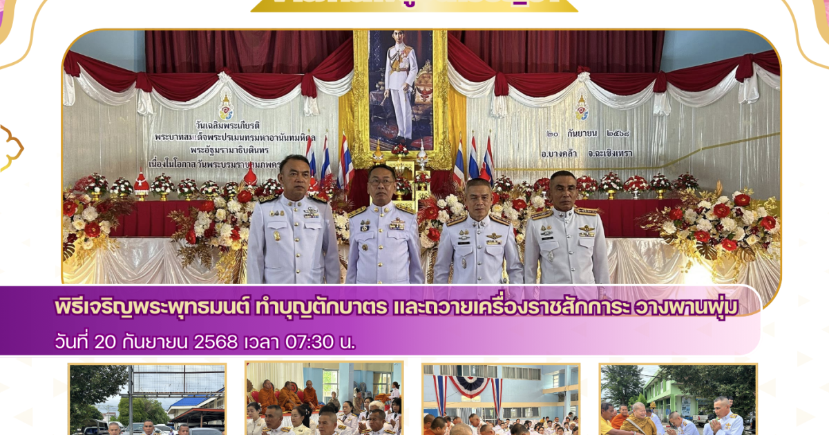 พิธีเจริญพระพุทธมนต์ ทำบุญตักบาตร และถวายเครื่องราชสักการะ วางพานพุ่ม 20 กันยายน 2025 โดย admbangkhla / ข่าวกิจกรรม,ข่าวภารกิจผู้บังคับบัญชา Post Views: 219 วันเสาร์ที่ 20 กันยายน พ.ศ.2568 เวลา 07.30 น. - พ.ต.อ.สุมิตร พรมตอง ผกก.สภ.บางคล้า - พ.ต.ท.จิระศักดิ์ สมศรี สว.สภ.สาวชะโงก - ร.ต.ต.ไกรลาศ แสงจันทร์ รอง สว.(สส.)สภ.บางคล้า ร่วมพิธีเจริญพระพุทธมนต์ ทำบุญตักบาตร และถวายเครื่องราชสักการะ วางพานพุ่ม เนื่องในวันคล้ายวันพระบรมราชสมภพ พระบาทสมเด็จพระปรเมนทรมหาอานันทมหิดล พระอัฐมรามาธิบดินทร ครบรอบ 100 ปี 20 กันยายน 2568 ณ หอประชุมที่ว่าการอำเภอบางคล้า โดยมี นายเอกราช กฤตยพงษ์ นายอำเภอบางคล้า เป็นประธานในพิธี, พร้อมด้วยหัวหน้าส่วนราชการ/องค์การปกครองส่วนถ้องถิ่น/รัฐวิสาหกิจ ร่วมพิธี ฯ ดังกล่าว โดยพร้อมเพรียงกัน