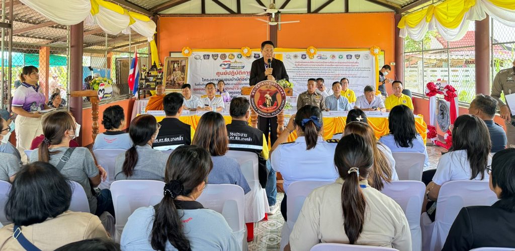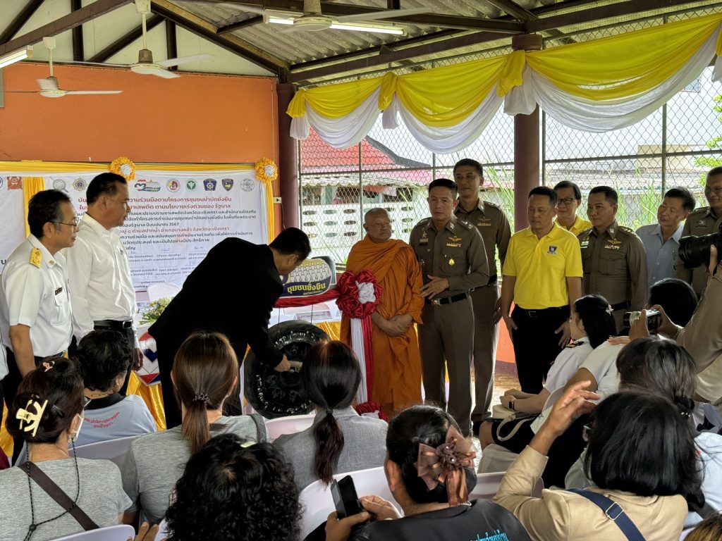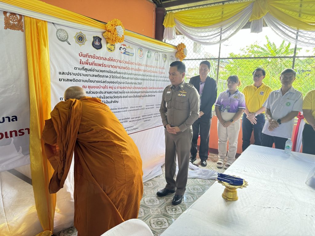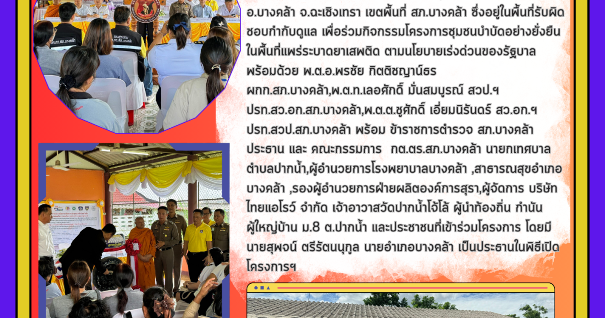 วันที่ 12 มิถุนายน 2567 เวลา 11.00 น. พล.ต.ต.นเรวิช สุคนธวิท ผบก.ภ.จว.ฉะเชิงเทรา,พ.ต.อ.สุขทัศน์ พุ่มพันธ์ม่วง รอง ผบก.ภ.จว.ฉะเชิงเทรา ได้เดินทางมาที่ หมู่บ้านบ้านไร่ ม.8 ต.ปากน้ำ อ.บางคล้า จ.ฉะเชิงเทรา เขตพื้นที่ สภ.บางคล้า ซึ่งอยู่ในพื้นที่รับผิดชอบกำกับดูแล เพื่อร่วมกิจกรรมโครงการชุมชนบำบัดอย่างยั่งยืนในพื้นที่แพร่ระบาดยาเสพติด ตามนโยบายเร่งด่วนของรัฐบาล พร้อมด้วย พ.ต.อ.พรชัย กิตติชญาน์ธร ผกก.สภ.บางคล้า,พ.ต.ท.เลอศักดิ์ มั่นสมบูรณ์ สวป.ฯ ปรท.สว.อก.สภ.บางคล้า,พ.ต.ต.ชูศักดิ์ เอี่ยมนิรันดร์ สว.อก.ฯ ปรท.สวป.สภ.บางคล้า พร้อม ข้าราชการตำรวจ สภ.บางคล้า ประธาน และ คณะกรรมการ กต.ตร.สภ.บางคล้า นายกเทศบาลตำบลปากน้ำ,ผู้อำนวยการโรงพยาบาลบางคล้า ,สาธารณสุขอำเภอบางคล้า ,รองผู้อำนวยการฝ่ายผลิตองค์การสุรา,ผู้จัดการ บริษัท ไทยแอโรว์ จำกัด เจ้าอาวาสวัดปากน้ำโจ้โล้ ผู้นำท้องถิ่น กำนัน ผู้ใหญ่บ้าน ม.8 ต.ปากน้ำ และประชาชนที่เข้าร่วมโครงการ โดยมี นายสุพจน์ ตรีรัตนนุกูล นายอำเภอบางคล้า เป็นประธานในพิธีเปิดโครงการฯ