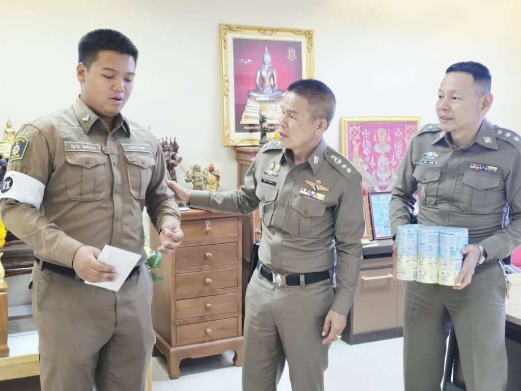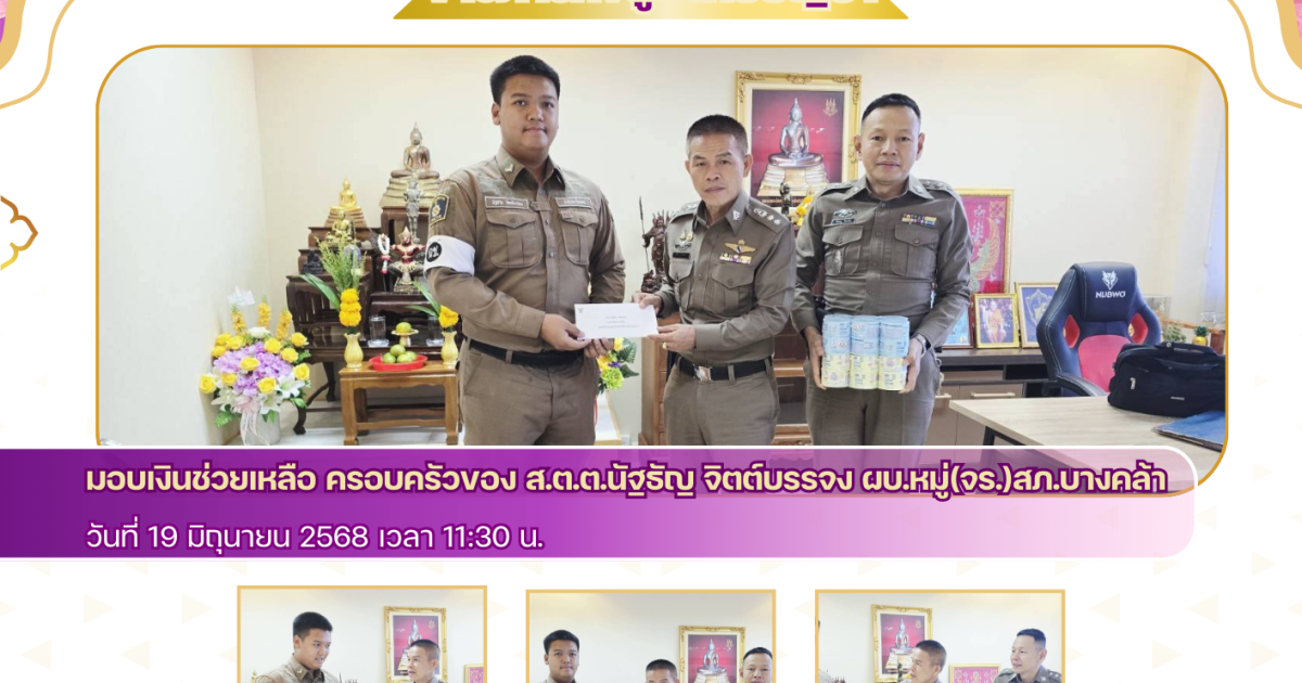 มอบเงินช่วยเหลือ ครอบครัวของ ส.ต.ต.นัฐธัญ จิตต์บรรจง ผบ.หมู่(จร.)สภ.บางคล้า 19 มิถุนายน 2025 โดย admbangkhla / ข่าวกิจกรรม Post Views: 226 เมื่อวันนี้ ๑๙ มิถุนายน ๒๕๖๘ เวลา ๑๑.๓๐ น. พ.ต.อ.สุมิตร พรมตอง ผกก.สภ.บางคล้า,,ร.ต.อ.พิเชษฐ สินเจริญ รอง สวป.สภ.บางคล้า, ได้มอบเงินช่วยเหลือ ครอบครัวของ ส.ต.ต.นัฐธัญ จิตต์บรรจง ผบ.หมู่(จร.)สภ.บางคล้า ซึ่งมารดาป่วยช่วยเหลือตัวเองไม่ได้เข้ารับการรักษาโรคประจำตัว ที่ โรงพยาบาลชลบุรี ในขณะนี้ได้มาพักฟื้นอาการป่วยที่บ้านพัก ซึ่งยังไม่สามารถช่วยเหลือตัวเองได้ โดย ส.ต.ต.นัญธัญ จิตต์บรรจง และครอบครัวได้สับเปลี่ยนดูแลรักษาอาการป่วยของมารดา จึงได้มอบเงินช่วยเหลือและสิ่งของที่ใช้ในการบริโภค ที่ห้องทำงานของ ผกก.สภ.บางคล้า เพื่อไปใช้ในการรักษาอาการป่วยต่อไป