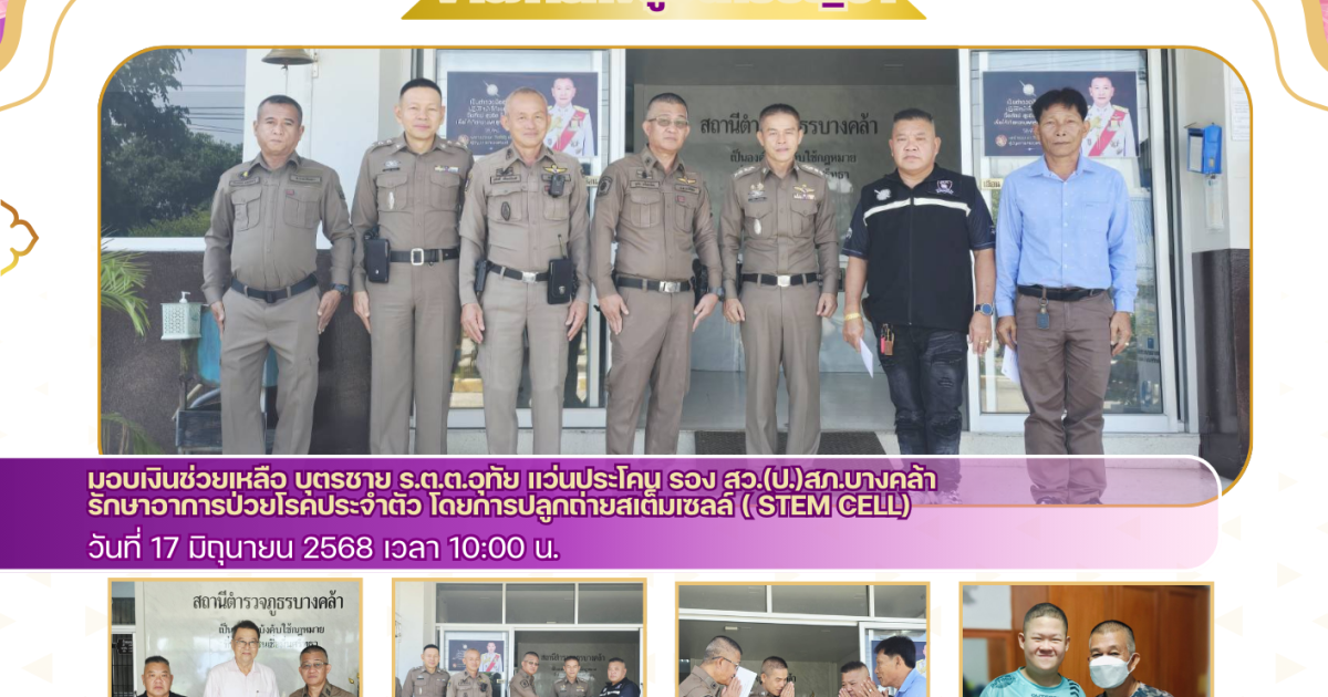 เวลา ๑๐.๐๐ น. นายศิริชัย เผ่าบรรจง นายกเทศมนตรีตำบลบางคล้า , นายยุทธ บุญสุวรรณ์ นายกเทศบาลตำบลปากน้ำ , นายเอกพันธ์ ตันเจริญ เลขานุการ กต.ตร.สภ.บางคล้า ได้มอบเงินช่วยเหลือ บุตรชาย ร.ต.ต.อุทัย แว่นประโคน รอง สว.(ป.)สภ.บางคล้า ให้แก่ ด.ช.จารุวัฒน์ แว่นประโคน (น้องออกัส) รักษาอาการป่วยโรคประจำตัว โดยการปลูกถ่ายสเต็มเซลล์ ( stem cell) และอยู่ในช่วงของพักฟื้น เฝ้าติดตามอาการป่วย ซึ่งไปเยี่ยมอาจมีการติดเชื้อและเป็นอันตรายต่อผู้ป่วย จึงได้มอบเงินช่วยเหลือเพื่อไปใช้ในการรักษาอาการป่วย ดังนี้.-