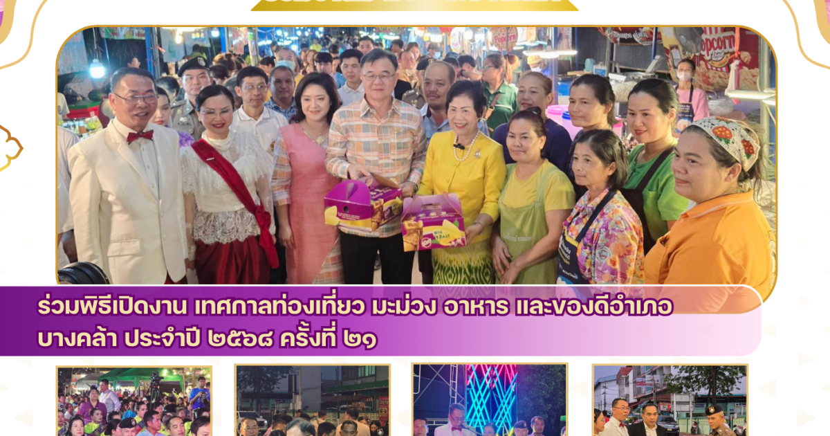 ร่วมพิธีเปิดงาน เทศกาลท่องเที่ยว มะม่วง อาหาร และของดีอำเภอบางคล้า ประจำปี 2568 ครั้งที่ 21 17 มีนาคม 2025 โดย admbangkhla / ข่าวกิจกรรม,ข่าวภารกิจผู้บังคับบัญชา Post Views: 129 วันนี้ (๑๗ มี.ค.๒๕๖๘) เวลา ๑๘.๓๐ น. พ.ต.อ.สุมิตร พรมตอง ผกก.สภ.บางคล้า, พ.ต.ท.จิระพงษ์ รอดเงิน รองผกก.ป.สภ.บางคล้า, พร้อมทั้งข้าราชการตำรวจ สภ.บางคล้า ร่วมพิธีเปิดงาน เทศกาลท่องเที่ยว มะม่วง อาหาร และของดีอำเภอบางคล้า ประจำปี ๒๕๖๘ ครั้งที่ ๒๑ ในระหว่างวันที่ ๑๗ – ๒๓ มีนาคม พ.ศ. ๒๕๖๘ ณ บริเวณหน้าที่ว่าการอำเภอบางคล้า โดยมี นายขจรเกียรติ รักพานิชมณี ผู้ว่าราชการจังหวัดฉะเชิงเทรา เป็นประธานในพิธี และ นายเอกราช กฤตยพงษ์ นายอำเภอบางคล้า, พร้อมด้วยหัวหน้าส่วนราชการ/องค์กรปกครองส่วนท้องถิ่น/ภาคเอกชน ร่วมพิธีฯ ดังกล่าว โดยพร้อมเพรียงกัน