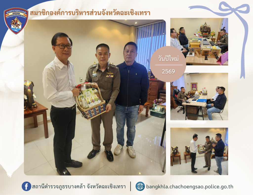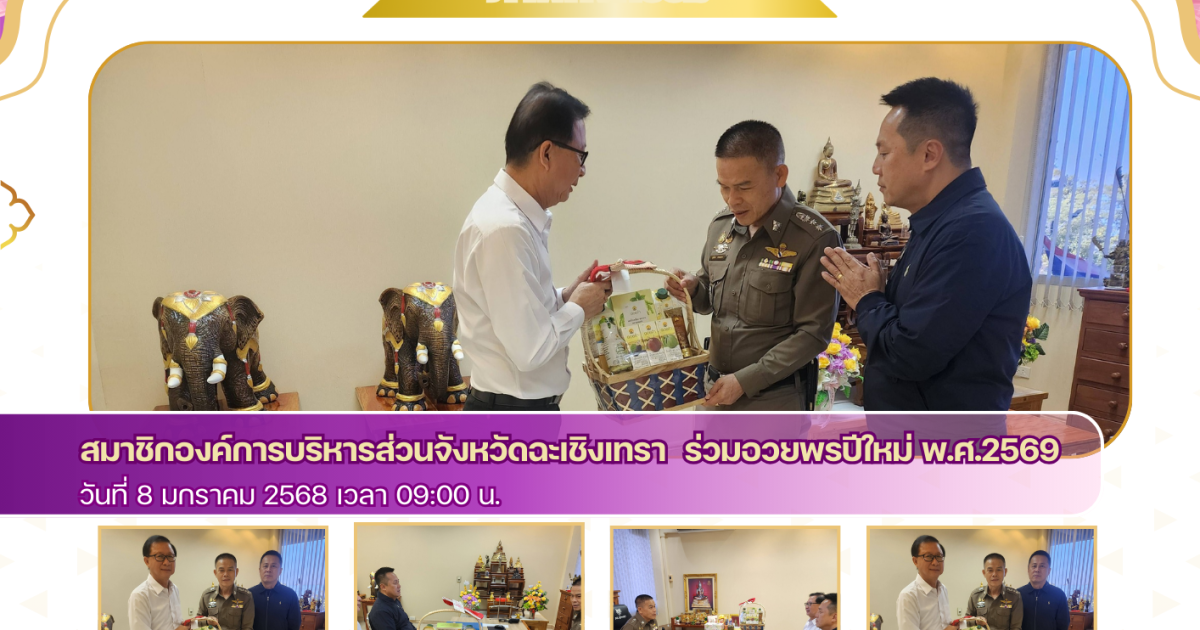 สมาชิกองค์การบริหารส่วนจังหวัดฉะเชิงเทรา ร่วมอวยพรปีใหม่ พ.ศ.2569 8 มกราคม 2026 โดย admbangkhla / ข่าวกิจกรรม,ข่าวภารกิจผู้บังคับบัญชา Post Views: 33 วันที่ 8 ม.ค.2569 เวลา 09.00 น. นายสุรชัย โชคชัยอำนวยพร ,นายสุรัตน์ จรกรรณ สมาชิกองค์การบริหารส่วนจังหวัดฉะเชิงเทรา ได้เข้าพบ พ.ต.อ.สุมิตร พรมตอง ผกก.สภ.บางคล้า ร่วมอวยพรและขอพร เนื่องในปีใหม่ พ.ศ.2569