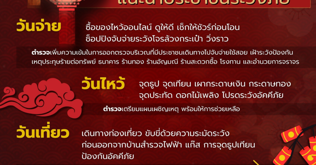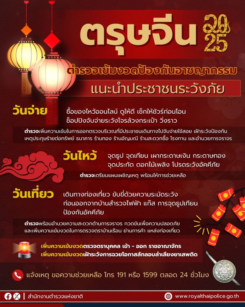 สำนักงานตำรวจแห่งชาติมีมาตรการเข้ม ดูแลประชาชนช่วงเทศกาล #ตรุษจีน 2568 ทั้งวันจ่าย วันไหว้ วันเที่ยว แนะระมัดระวังภัย