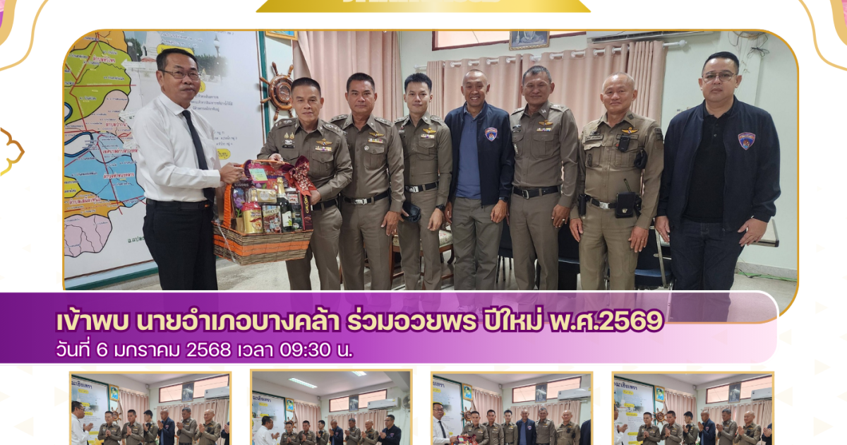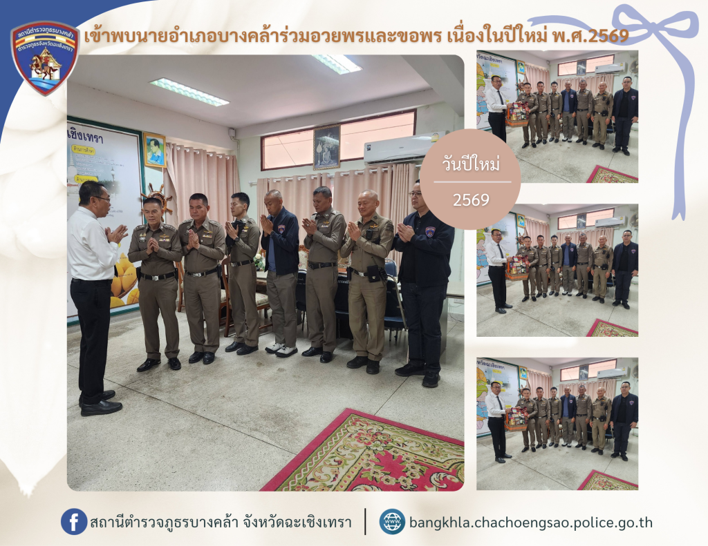 พ.ต.อ.สุมิตร พรมตอง ผกก.สภ.บางคล้า,พ.ต.ท.จิระพงษ์ รอดเงิน รอง ผกก.ป.สภ.บางคล้า,พ.ต.ท.ธงชัย วงษ์บุดดา รอง ผกก.(สอบสวน) สภ.บางคล้า , พ.ต.ท.ไพรัช มณีพันธ์ รอง ผกก.สส.สภ.บางคล้า , พ.ต.ท.พชรธัช สมานกิตติธร สว.สส.สภ.บางคล้า , พ.ต.ท.เลอศักดิ์ มั่นสมบูรณ์ สว.อก.สภ.บางคล้า , พ.ต.ท.ชูศักดิ์ เอี่ยมนิรันดร์ สวป.สภ.บางคล้า ได้เข้าพบ นายเอกราช กฤตยพงษ์ นายอำเภอบางคล้า ร่วมอวยพรและขอพร เนื่องในปีใหม่ พ.ศ.2569
