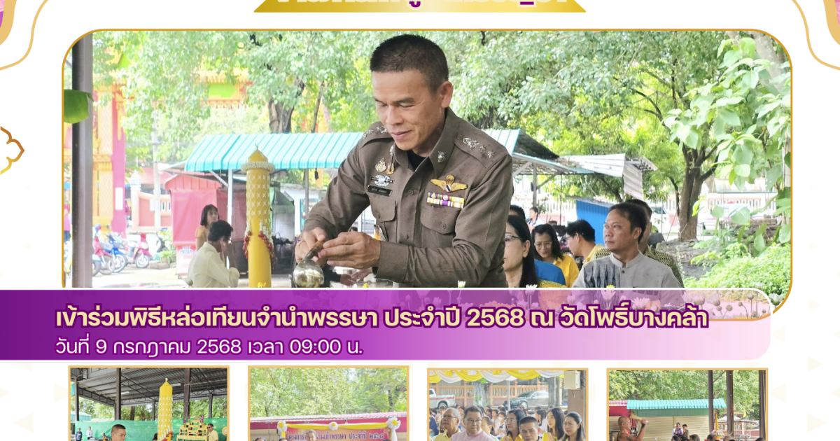 เข้าร่วมพิธีหล่อเทียนจำนำพรรษา ประจำปี 2568 ณ วัดโพธิ์บางคล้า 9 กรกฎาคม 2025 โดย admbangkhla / ข่าวกิจกรรม,ข่าวภารกิจผู้บังคับบัญชา Post Views: 222 วันนี้ ( ๙ ก.ค.๒๕๖๘ ) เวลา ๐๙.๐๐ น. - พ.ต.อ.สุมิตร พรมตอง ผกก.สภ.บางคล้า และข้าราชการตำรวจ สภ.บางคล้า เข้าร่วมพิธีหล่อเทียนจำนำพรรษา ประจำปี ๒๕๖๘ ณ วัดโพธิ์บางคล้า ต.บางคล้า อ.บางคล้า จ.ฉะเชิงเทรา โดยมี นายศิริชัย เผ่าบรรจง นายกเทศบาลตำบลบางคล้า เป็นประธานในพิธี ,พร้อมด้วยหัวหน้าส่วนราชการ/องค์การปกครองส่วนถ้องถิ่น/ภาคเอกชน ร่วมพิธีฯ ดังกล่าว โดยพร้อมเพรียงกัน