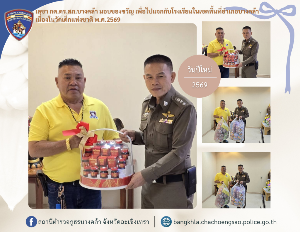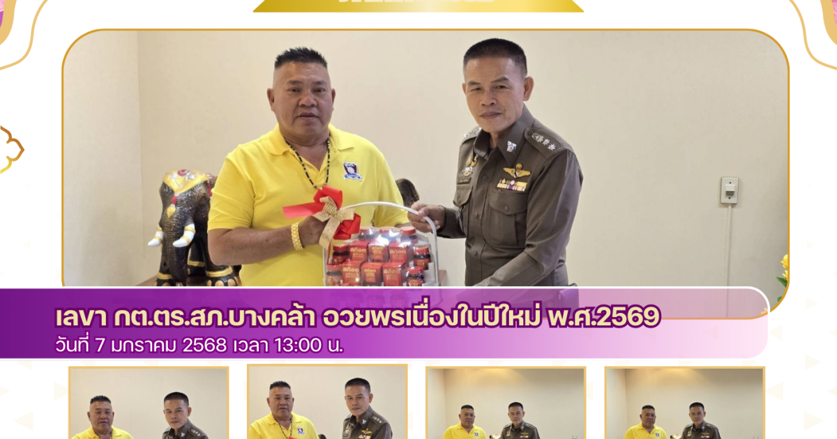 เลขา กต.ตร.สภ.บางคล้า อวยพรเนื่องในปีใหม่ พ.ศ.2569 7 มกราคม 2026 โดย admbangkhla / ข่าวกิจกรรม,ข่าวภารกิจผู้บังคับบัญชา,ผลงานคณะกรรมการ กต.ตร. Post Views: 10 วันที่ 7 ม.ค.2569 เวลา 13.00 น. นายเอกพันธ์ ตันเจริญ เลขา กต.ตร.สภ.บางคล้า ได้เข้าพบ พ.ต.อ.สุมิตร พรมตอง ผกก.สภ.บางคล้าอวยพรและขอพร เนื่องในปีใหม่ พ.ศ.2569 และเป็นตัวแทนได้รับมอบหมายจากนายศิริชัย เผ่าบรรจง นายกเทศมนตรีตำบลบางคล้า / ประธาน กต.ตร.สภ.บางคล้า มอบของขวัญ เพื่อไปแจกกับโรงเรียนในเขตพื้นที่อำเภอบางคล้า เนื่องในวัดเด็กแห่งชาติ พ.ศ.2569 ต่อไป