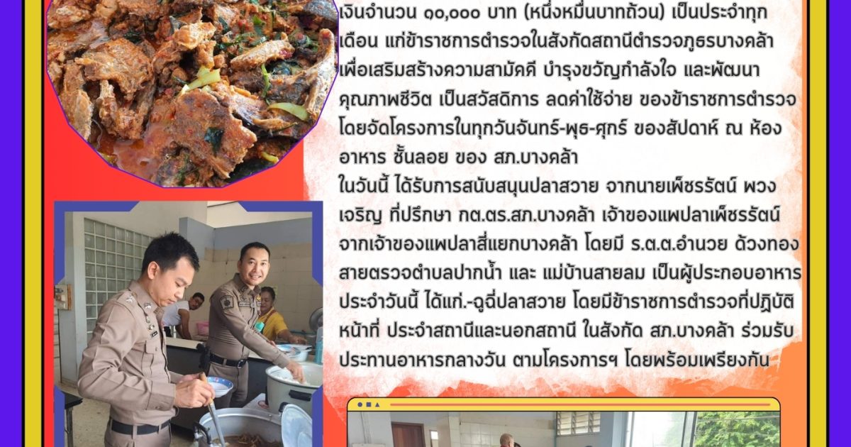 วันนี้ (๙ ตุลาคม ๒๕๖๗) เวลา ๑๒.๐๐ น. พ.ต.อ.พรชัย กิตติชญาน์ธร ผกก.สภ.บางคล้า ได้จัดโครงการสวัสดิการอาหารกลางวันร่วมกับคณะกรรมการ กต.ตร.สภ.บางคล้า ได้สนับสนุนเงินจำนวน ๑๐,๐๐๐ บาท (หนึ่งหมื่นบาทถ้วน) เป็นประจำทุกเดือน แก่ข้าราชการตำรวจในสังกัดสถานีตำรวจภูธรบางคล้า เพื่อเสริมสร้างความสามัคคี บำรุงขวัญกำลังใจ และพัฒนาคุณภาพชีวิต เป็นสวัสดิการ ลดค่าใช้จ่าย ของข้าราชการตำรวจ โดยจัดโครงการในทุกวันจันทร์-พุธ-ศุกร์ ของสัปดาห์ ณ ห้องอาหาร ชั้นลอย ของ สภ.บางคล้าในวันนี้ ได้รับการสนับสนุนปลาสวาย จากนายเพ็ชรรัตน์ พวงเจริญ ที่ปรึกษา กต.ตร.สภ.บางคล้า เจ้าของแพปลาเพ็ชรรัตน์ จากเจ้าของแพปลาสี่แยกบางคล้า โดยมี ร.ต.ต.อำนวย ด้วงทอง สายตรวจตำบลปากน้ำ และ แม่บ้านสายลม เป็นผู้ประกอบอาหาร ประจำวันนี้ ได้แก่.-ฉูฉี่ปลาสวาย โดยมีข้าราชการตำรวจที่ปฏิบัติหน้าที่ ประจำสถานีและนอกสถานี ในสังกัด สภ.บางคล้า ร่วมรับประทานอาหารกลางวัน ตามโครงการฯ โดยพร้อมเพรียงกัน