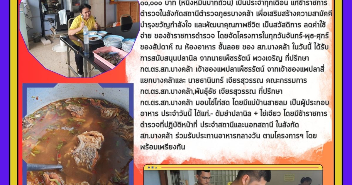วันนี้ (๑๑ ตุลาคม ๒๕๖๗) เวลา ๑๒.๐๐ น. พ.ต.อ.พรชัย กิตติชญาน์ธร ผกก.สภ.บางคล้า ได้จัดโครงการสวัสดิการอาหารกลางวันร่วมกับคณะกรรมการ กต.ตร.สภ.บางคล้า ได้สนับสนุนเงินจำนวน ๑๐,๐๐๐ บาท (หนึ่งหมื่นบาทถ้วน) เป็นประจำทุกเดือน แก่ข้าราชการตำรวจในสังกัดสถานีตำรวจภูธรบางคล้า เพื่อเสริมสร้างความสามัคคี บำรุงขวัญกำลังใจ และพัฒนาคุณภาพชีวิต เป็นสวัสดิการ ลดค่าใช้จ่าย ของข้าราชการตำรวจ โดยจัดโครงการในทุกวันจันทร์-พุธ-ศุกร์ ของสัปดาห์ ณ ห้องอาหาร ชั้นลอย ของ สภ.บางคล้า ในวันนี้ ได้รับการสนับสนุนปลานิล จากนายเพ็ชรรัตน์ พวงเจริญ ที่ปรึกษา กต.ตร.สภ.บางคล้า เจ้าของแพปลาเพ็ชรรัตน์ จากเจ้าของแพปลาสี่แยกบางคล้าและ นายธานินทร์ เจียรสุวรรณ คณะกรรมการ กต.ตร.สภ.บางคล้า,พันธุ์ธัช เจียรสุวรรณ ที่ปรึกษา กต.ตร.สภ.บางคล้า มอบไข่ไก่สด โดยมีแม่บ้านสายลม เป็นผู้ประกอบอาหาร ประจำวันนี้ ได้แก่.- ต้มยำปลานิล + ไข่เจียว โดยมีข้าราชการตำรวจที่ปฏิบัติหน้าที่ ประจำสถานีและนอกสถานี ในสังกัด สภ.บางคล้า ร่วมรับประทานอาหารกลางวัน ตามโครงการฯ โดยพร้อมเพรียงกัน