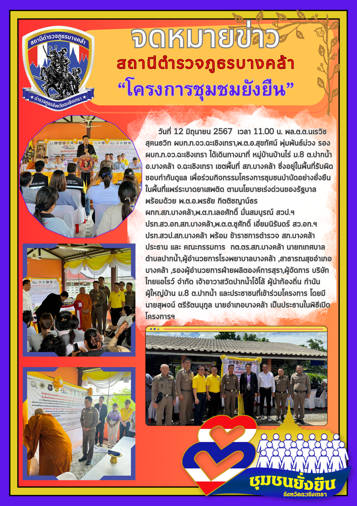 วันที่ 12 มิถุนายน 2567 เวลา 11.00 น. พล.ต.ต.นเรวิช สุคนธวิท ผบก.ภ.จว.ฉะเชิงเทรา,พ.ต.อ.สุขทัศน์