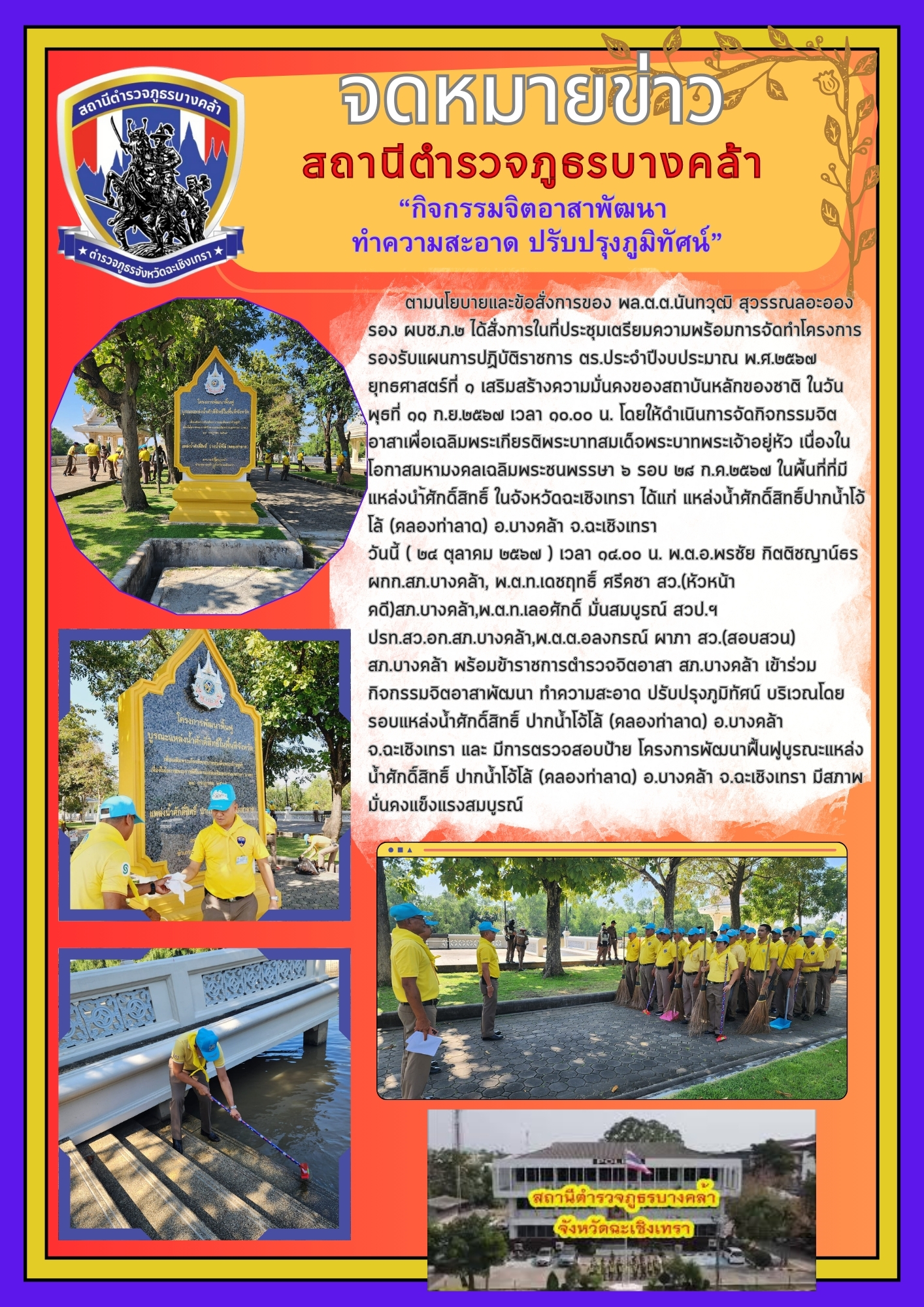 กิจกรรมจิตอาสาพัฒนา ทำความสะอาด ปรับปรุงภูมิทัศน์ บริเวณโดยรอบแหล่งน้ำศักดิ์สิทธิ์ ปากน้ำโจ้โล้ (คลองท่าลาด) อ.บางคล้า จ.ฉะเชิงเทรา