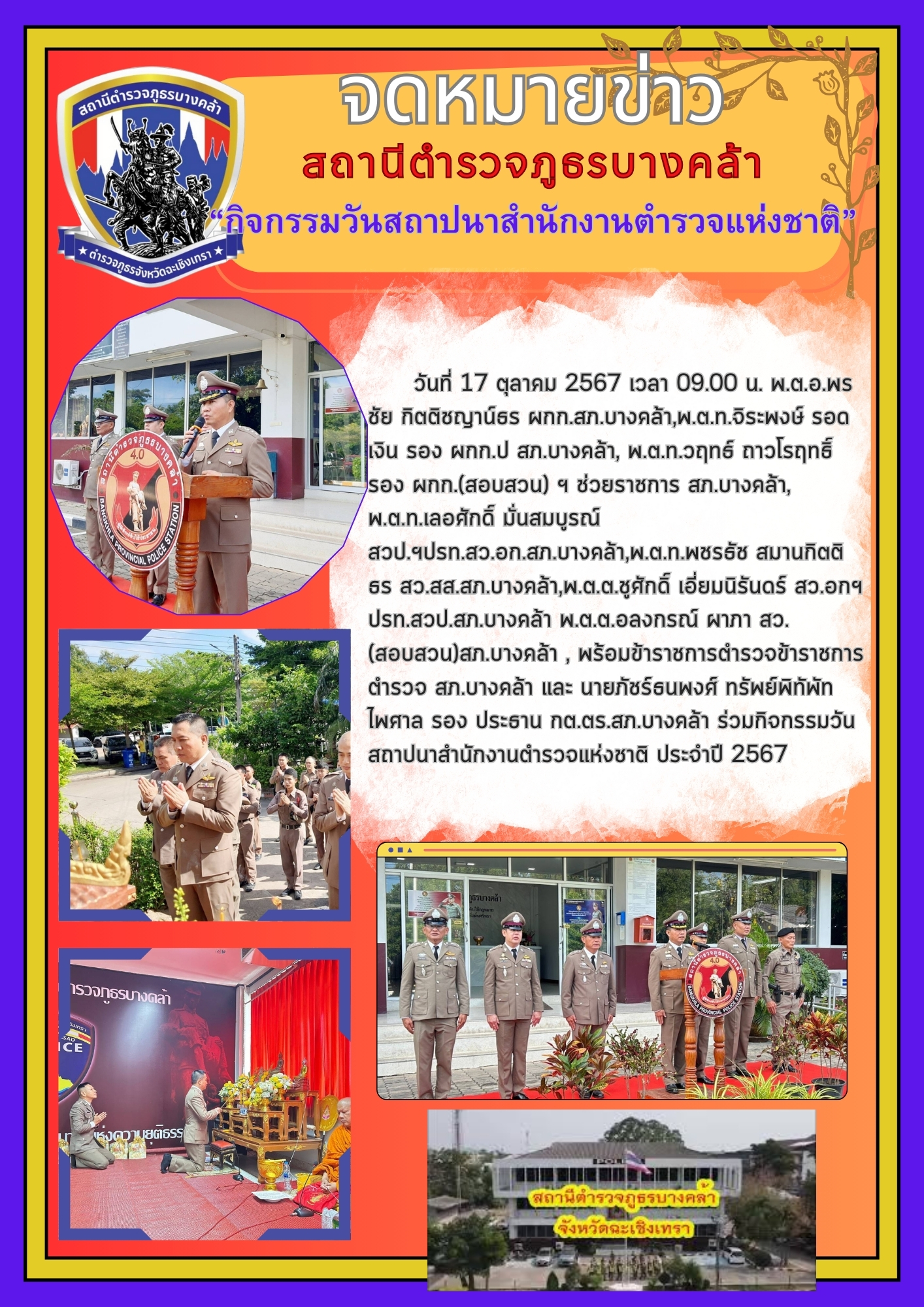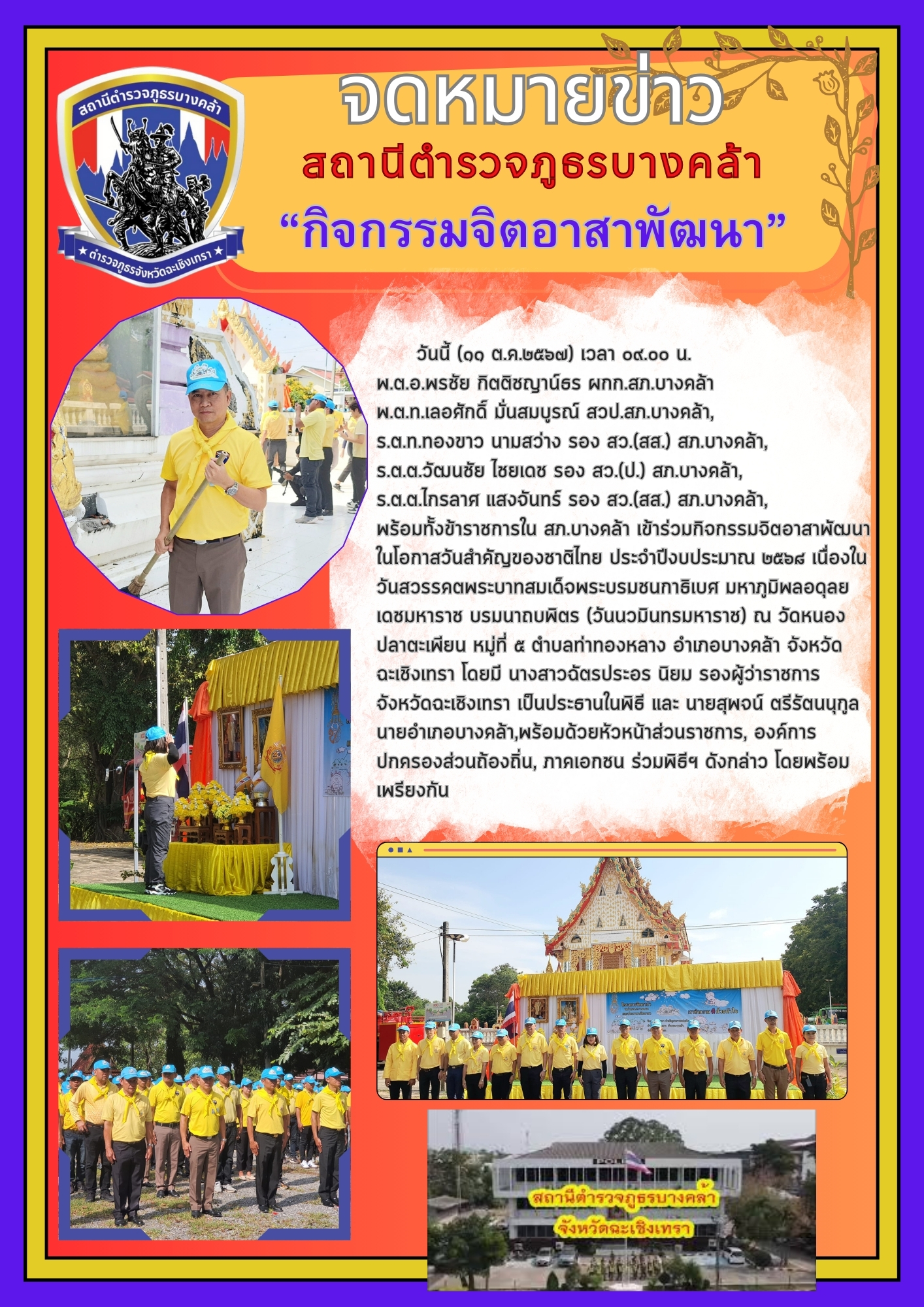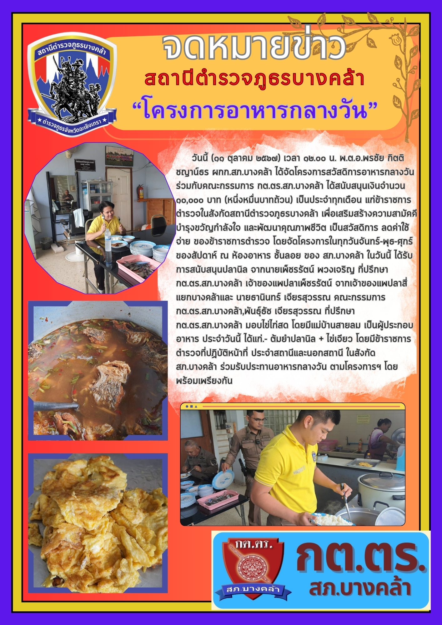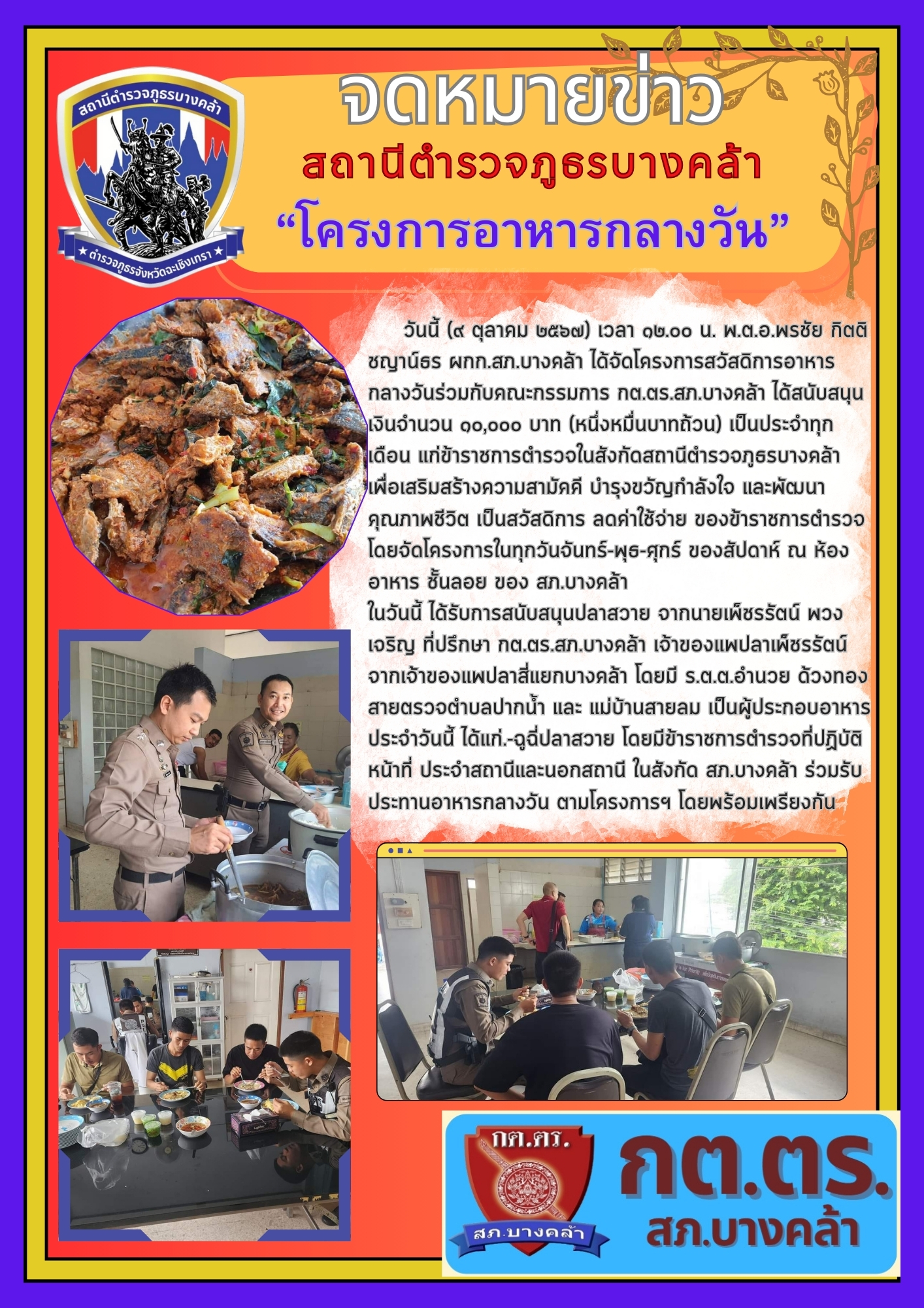 วันนี้ (๑๑ ตุลาคม ๒๕๖๗) เวลา ๑๒.๐๐ น. พ.ต.อ.พรชัย กิตติชญาน์ธร ผกก.สภ.บางคล้า ได้จัดโครงการสวัส