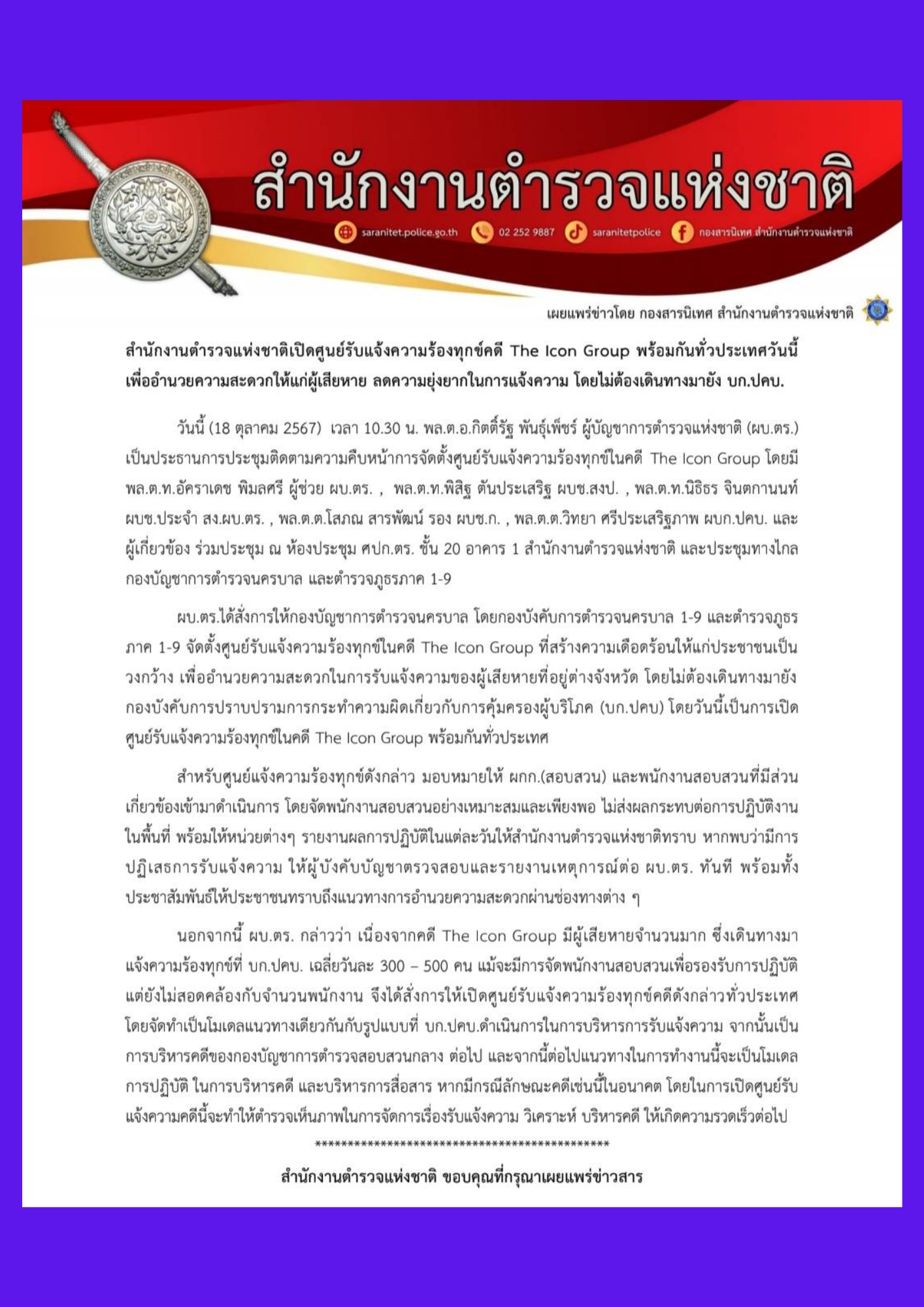 สำนักงานตำรวจแห่งชาติเปิดศูนย์รับแจ้งความร้องทุกข์คดี The Icon Group