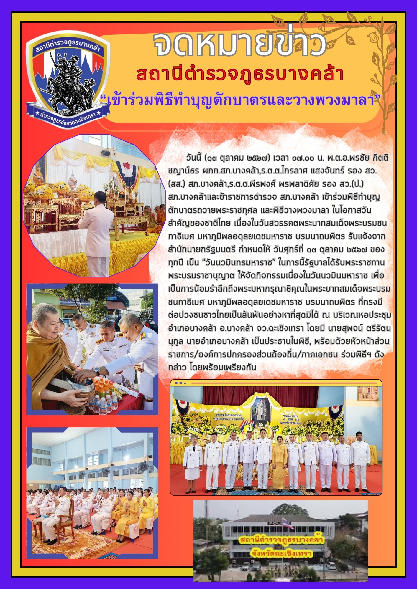 วันนี้ (๑๓ ตุลาคม ๒๕๖๗) เวลา ๐๗.๐๐ น. พ.ต.อ.พรชัย กิตติชญาน์ธร ผกก.สภ.บางคล้า,ร.ต.ต.ไกรลาศ แสงจ