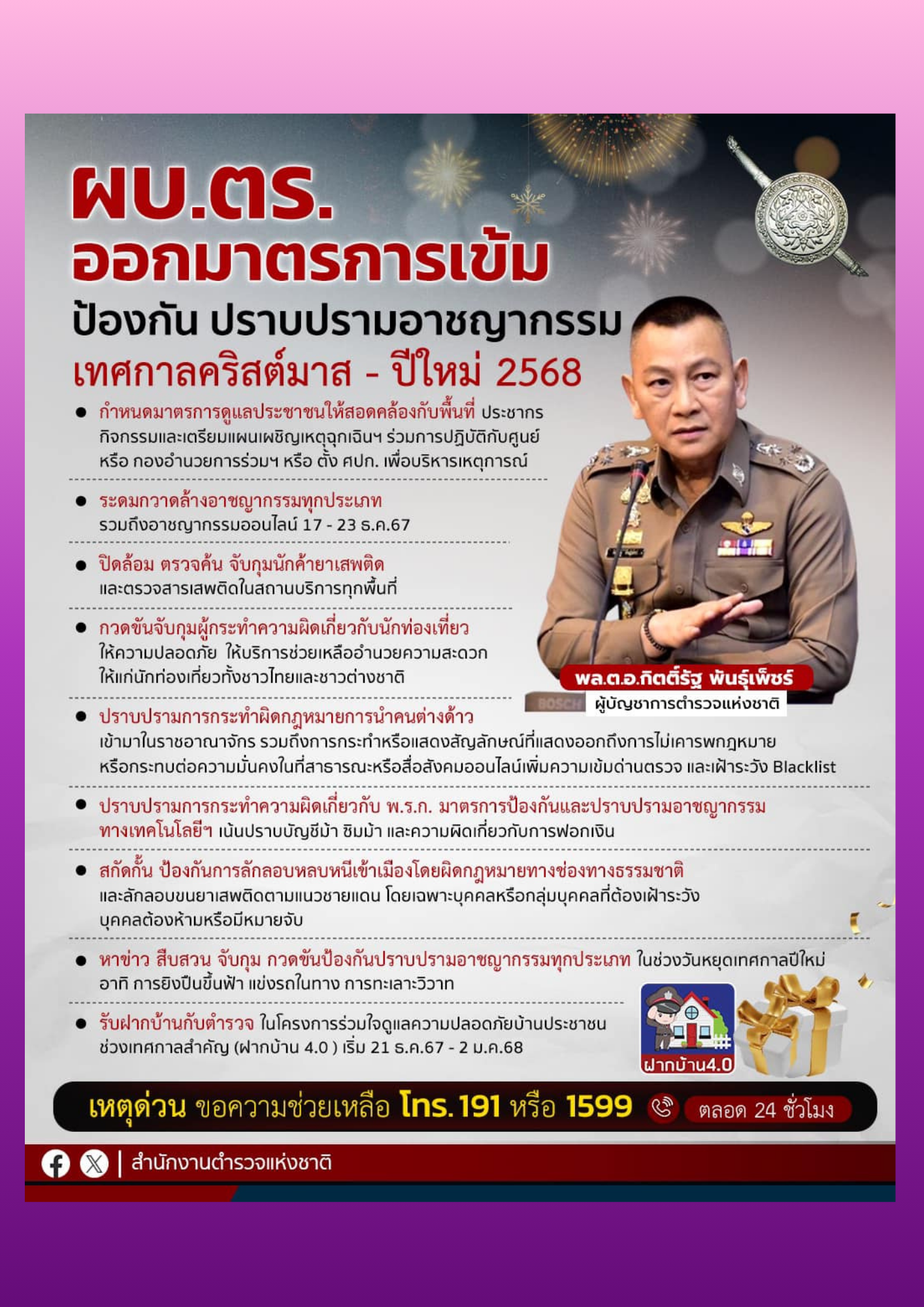 “พิทักษ์ 1” ออกมาตรการเข้มดูแลชีวิตและทรัพย์สินของพี่น้องประชาชน ช่วงเทศกาลปีใหม่ พล.ต.อ