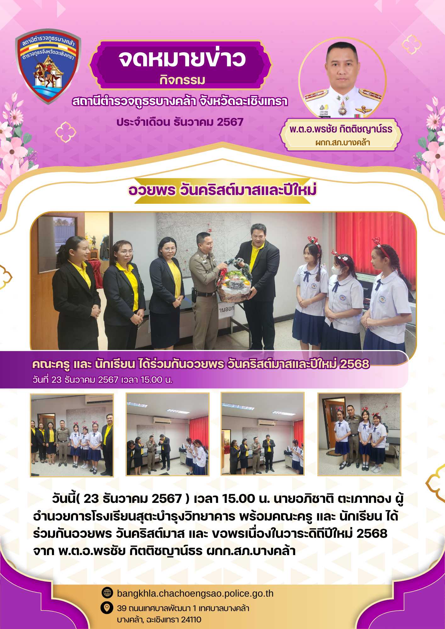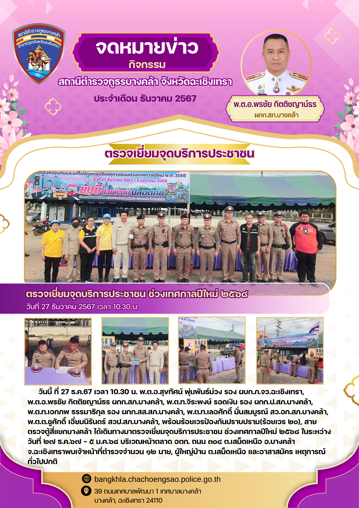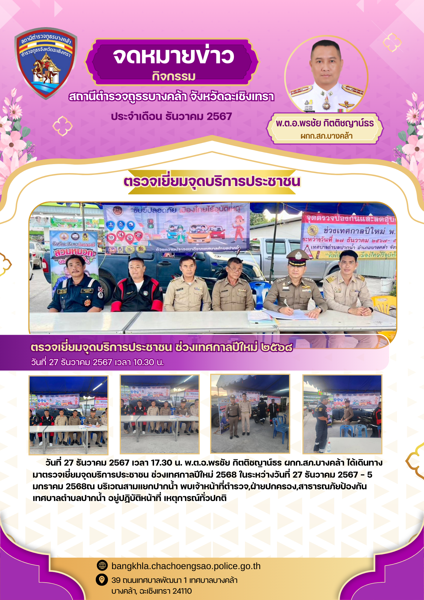 วันที่ 27 ธันวาคม 2567 เวลา 17.30 น. พ.ต.อ.พรชัย กิตติชญาน์ธร ผกก.สภ.บางคล้า ได้เดินทางมาตรวจเย