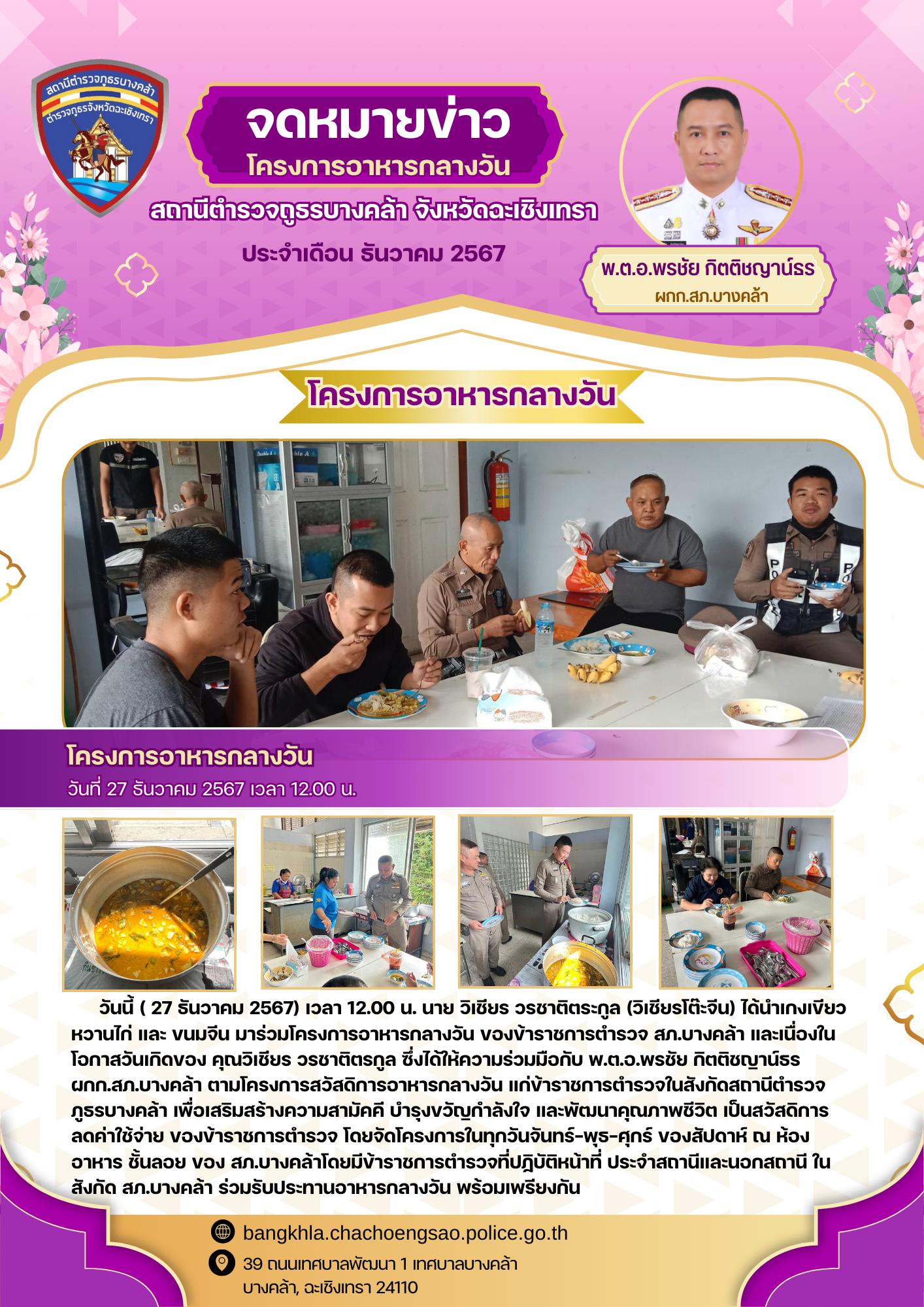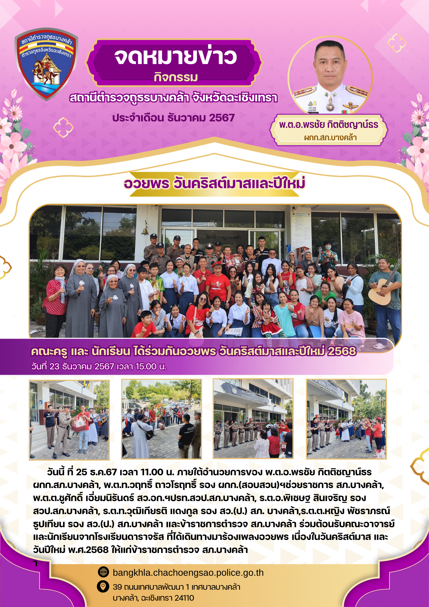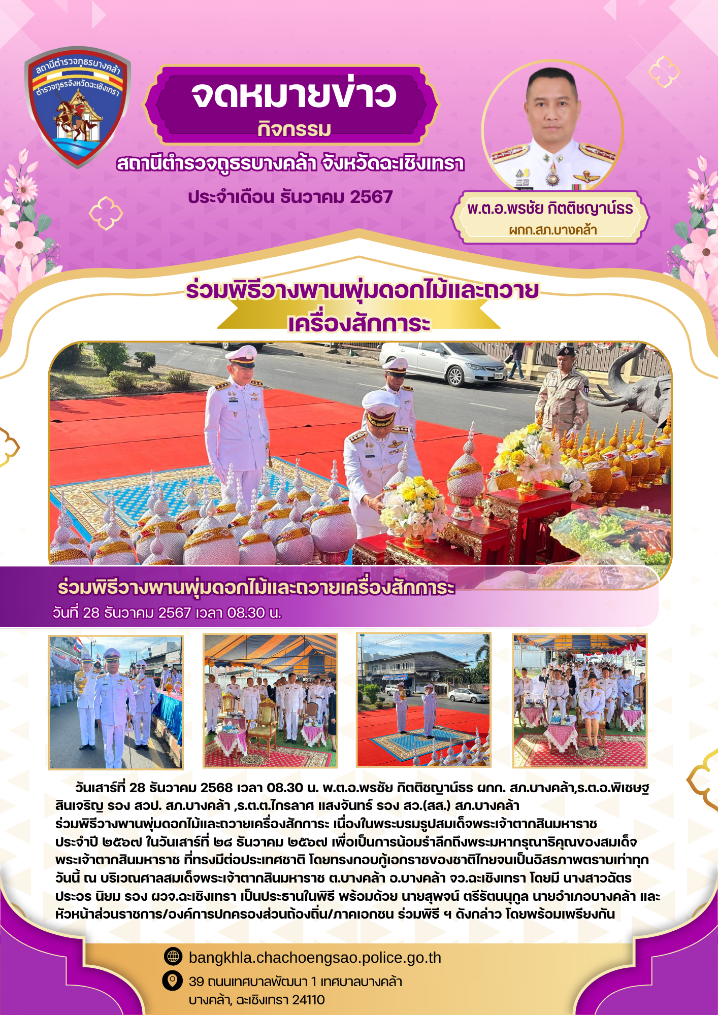 วันนี้ ที่ 25 ธ.ค.67 เวลา 11.00 น. ภายใต้อำนวยการของ พ.ต.อ.พรชัย กิตติชญาน์ธร ผกก.สภ.บางคล้า, พ