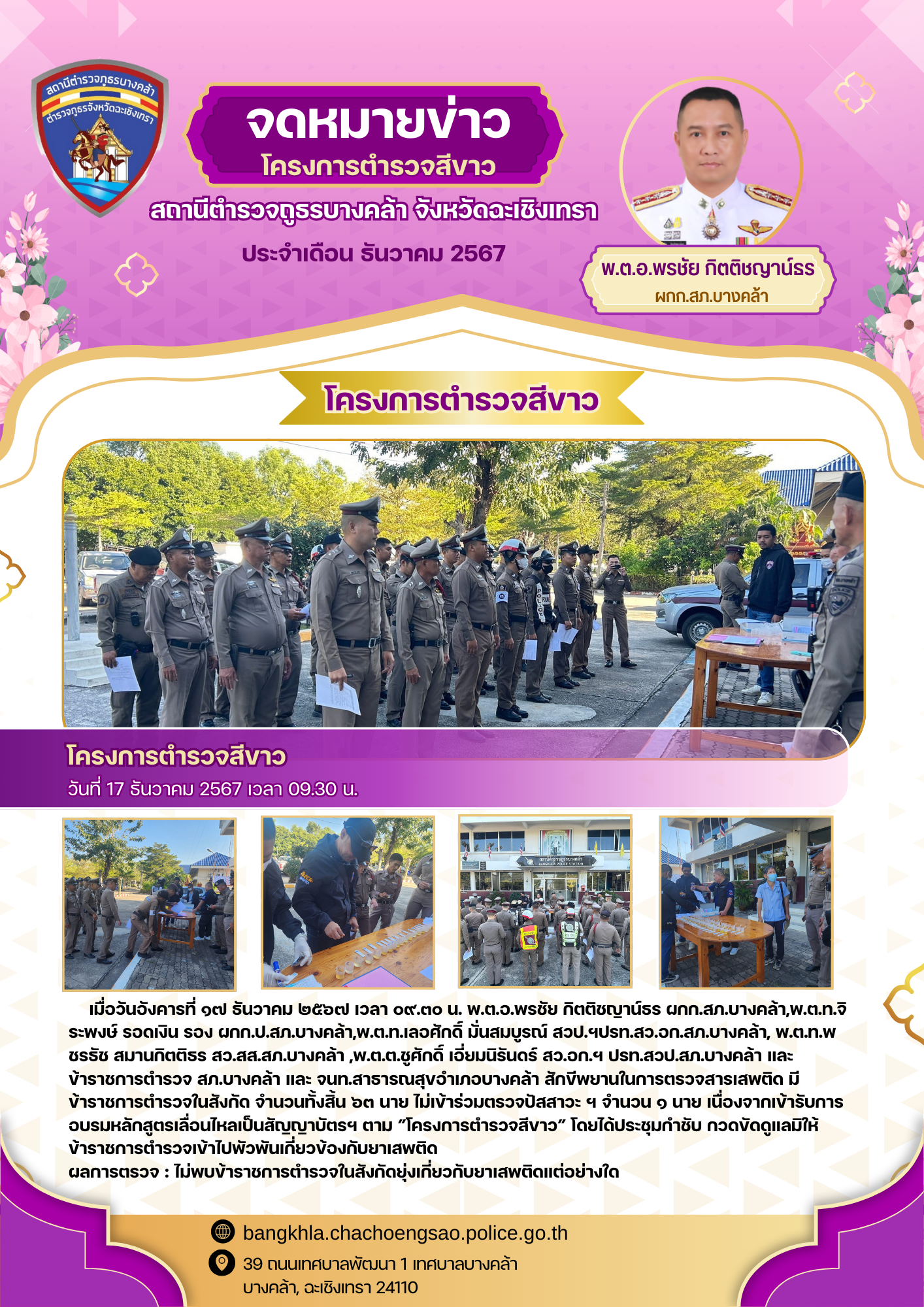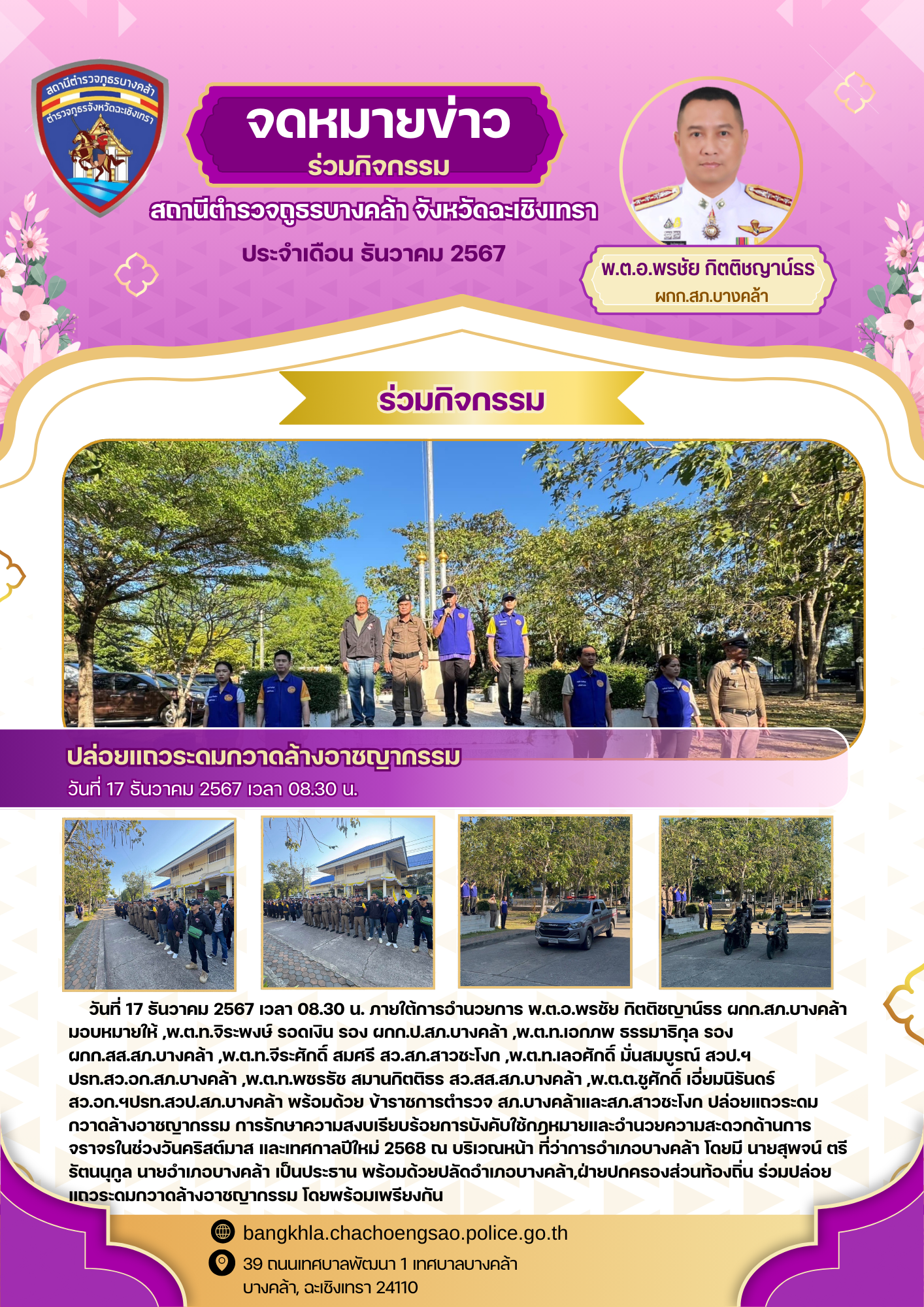 วันที่ 17 ธันวาคม 2567 เวลา 08.30 น. ภายใต้การอำนวยการ พ.ต.อ.พรชัย กิตติชญาน์ธร ผกก.สภ.บางคล้า