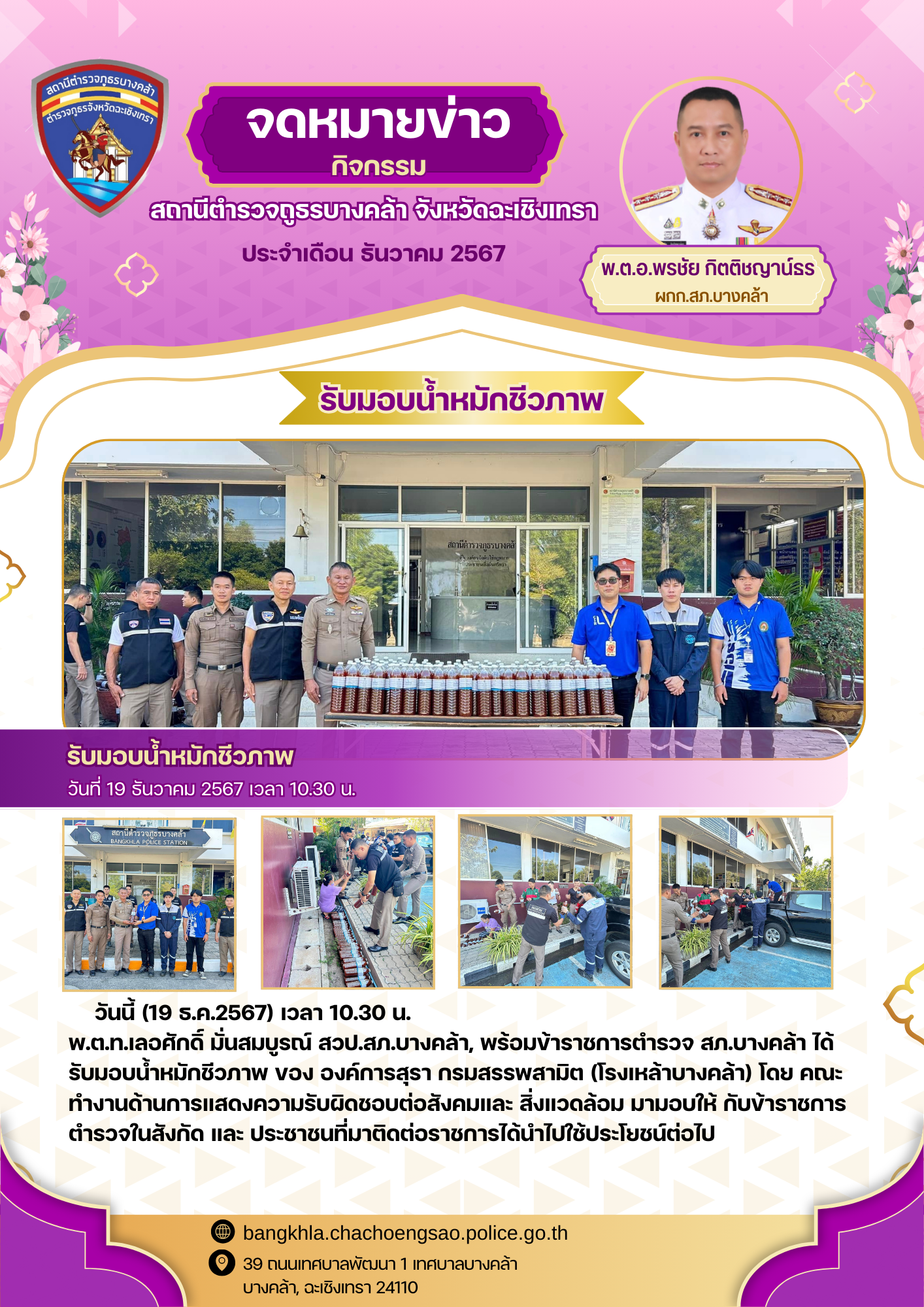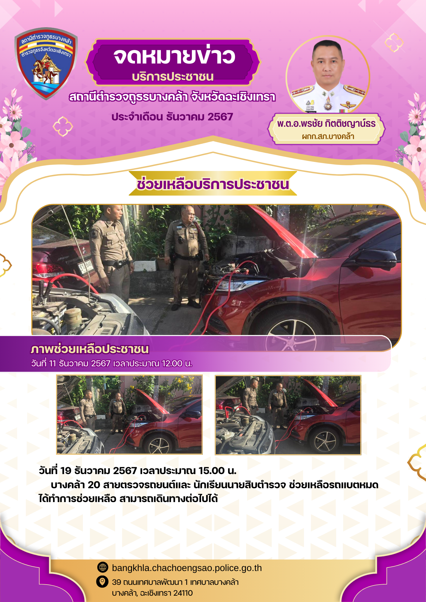 เมื่อวันอังคารที่ ๑๗ ธันวาคม ๒๕๖๗ เวลา ๐๙.๓๐ น. พ.ต.อ.พรชัย กิตติชญาน์ธร ผกก.สภ.บางคล้า,พ.ต.ท.จ