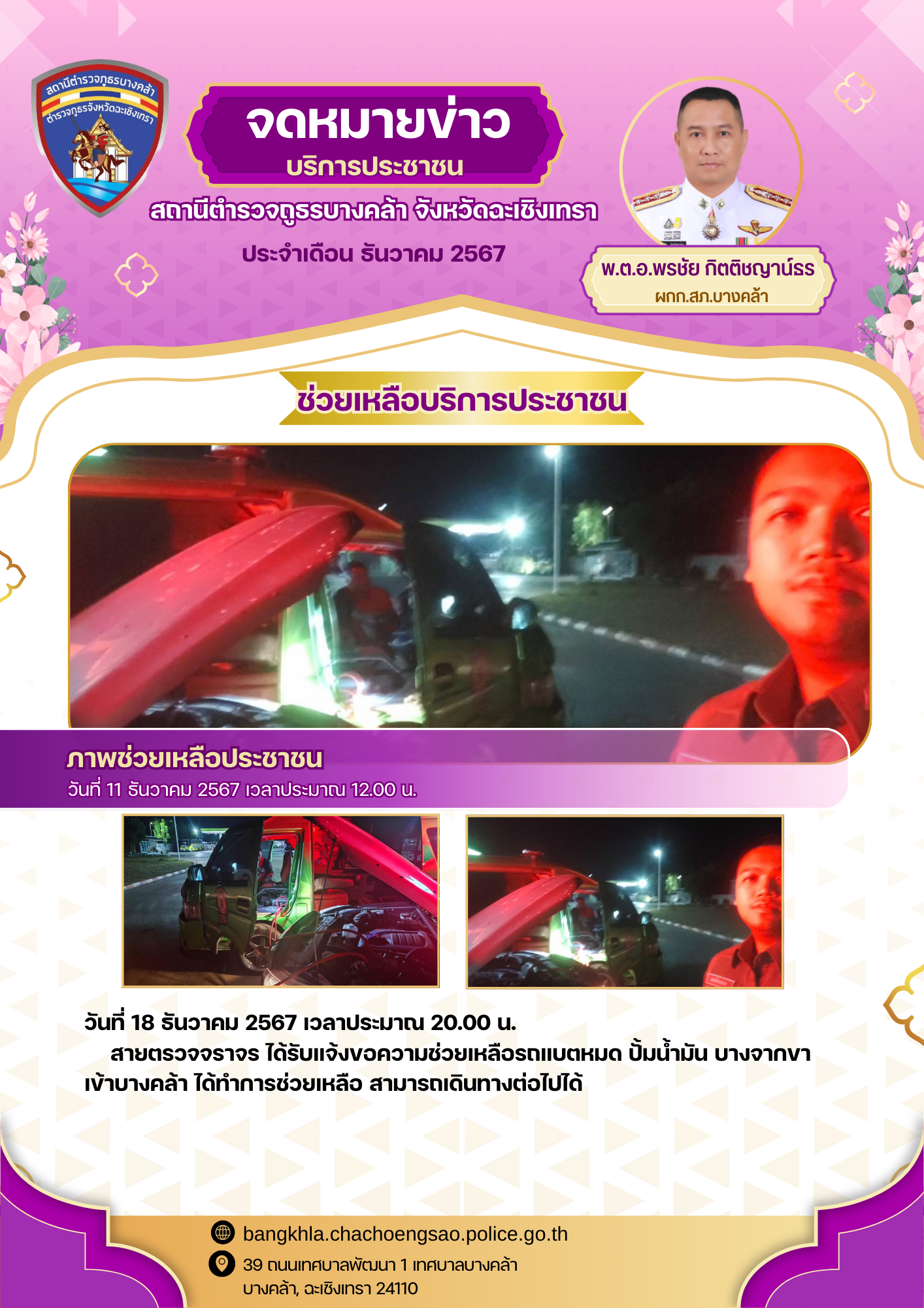 วันที่ 18 ธันวาคม 2567 เวลาประมาณ 20.00 น. สายตรวจจราจร ได้รับแจ้งขอความช่วยเหลือรถแบตหมด ปั้มน