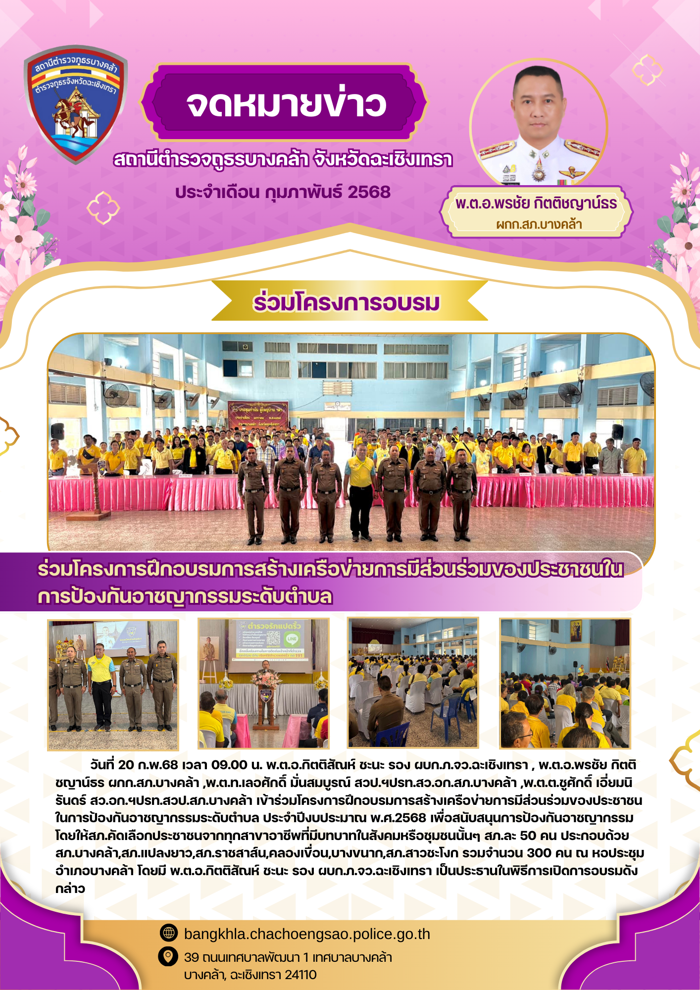 วันอังคารที่ 18 กุมภาพันธ์ 2568 เวลา 13.00 น. พ.ต.อ.พรชัย กิตติชญาน์ธร ผกก.สภ.บางคล้า ประช