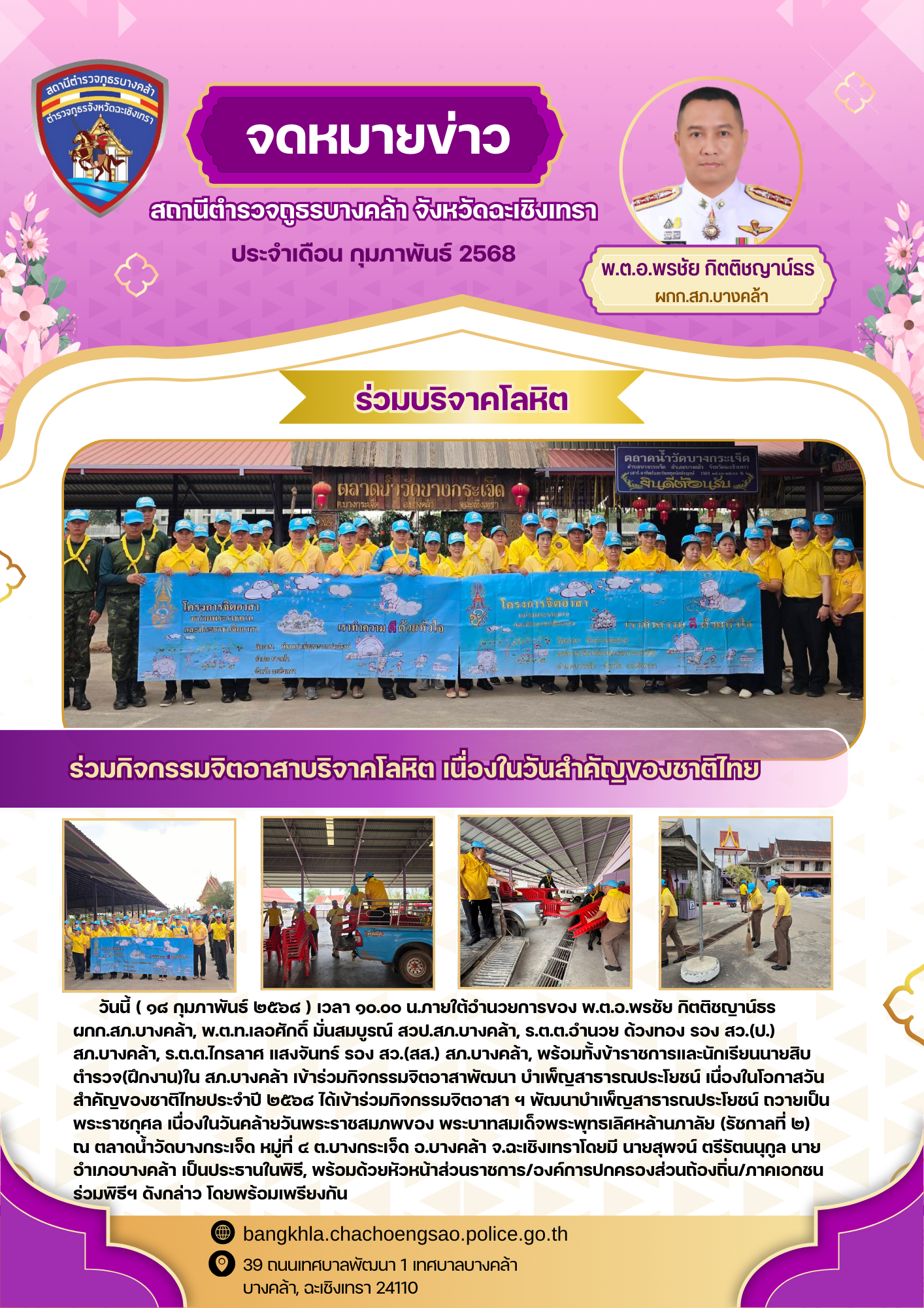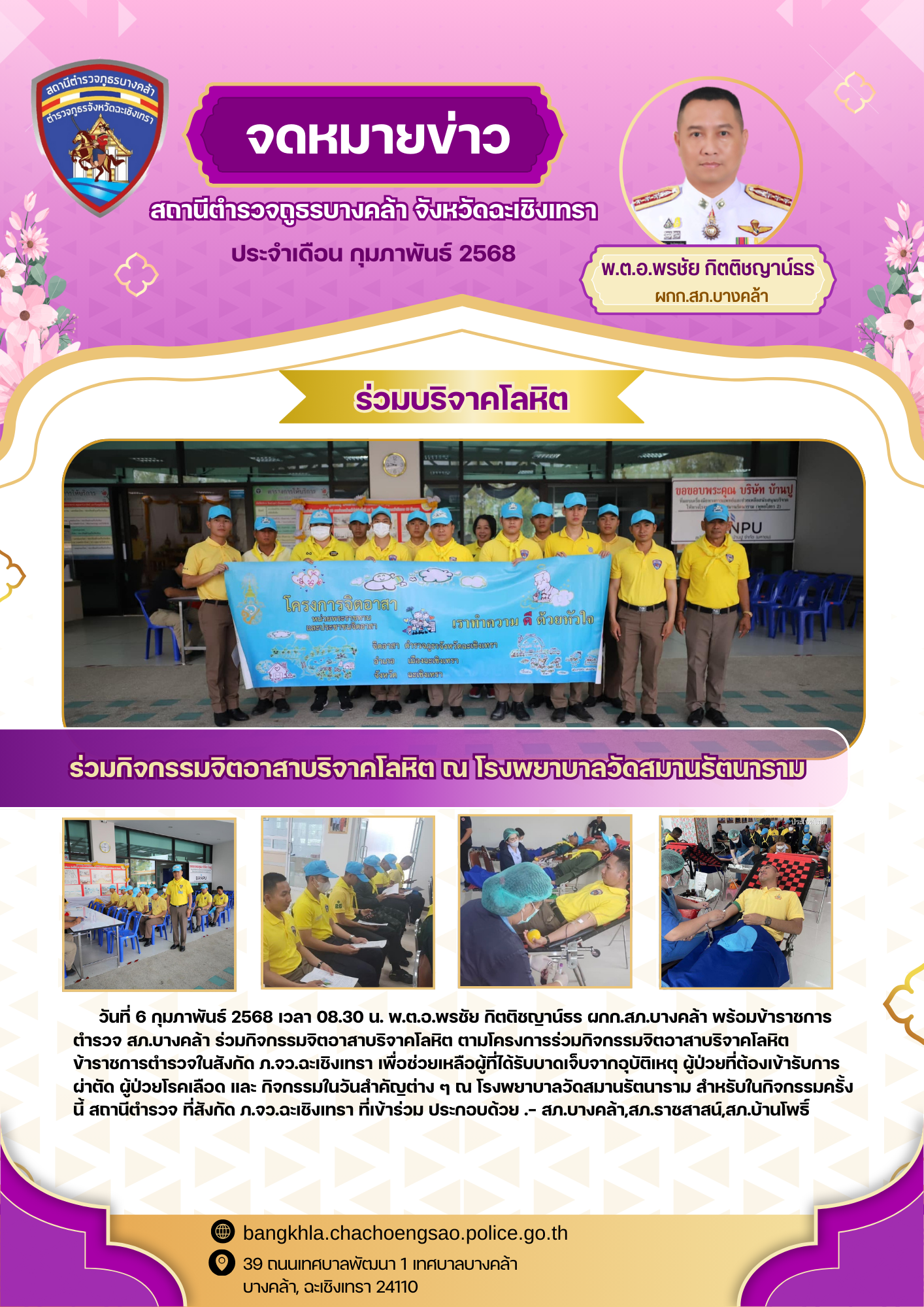 วันนี้ (๒๑ กุมภาพันธ์ ๒๕๖๘) เวลา ๑๒.๐๐ น. พ.ต.อ.พรชัย กิตติชญาน์ธร ผกก.สภ.บางคล้า ได้จัดโค