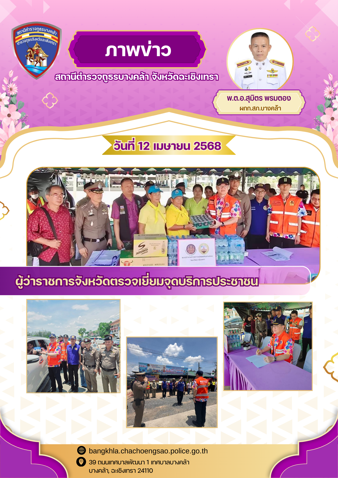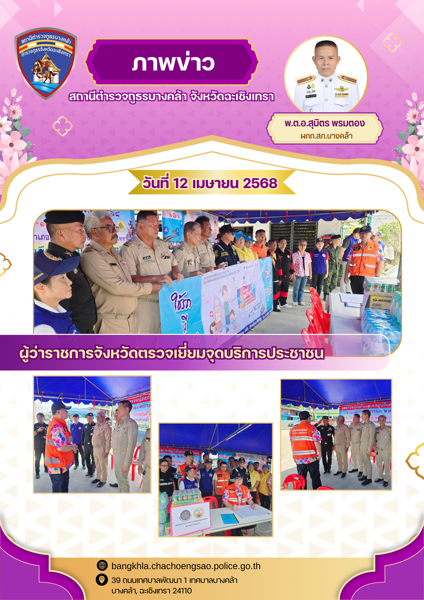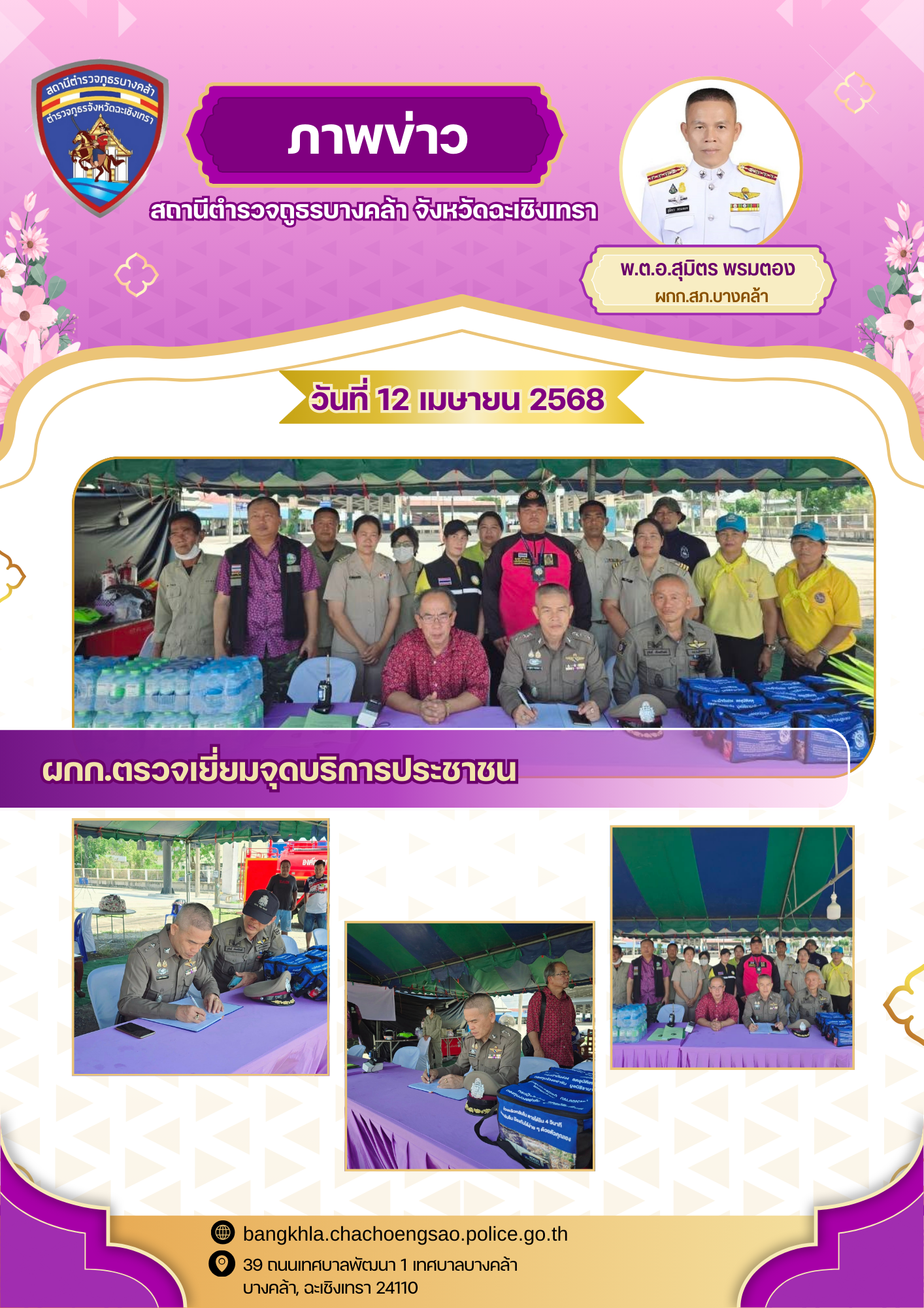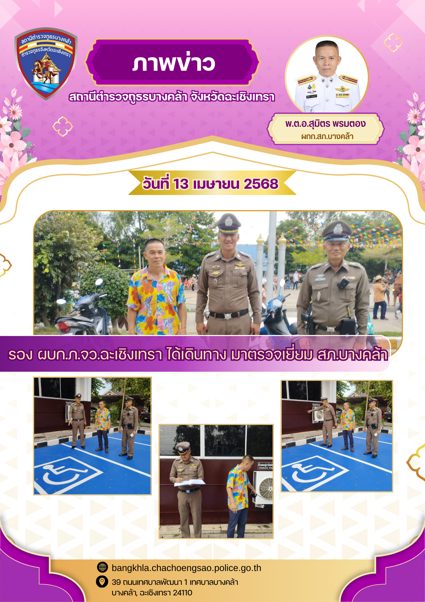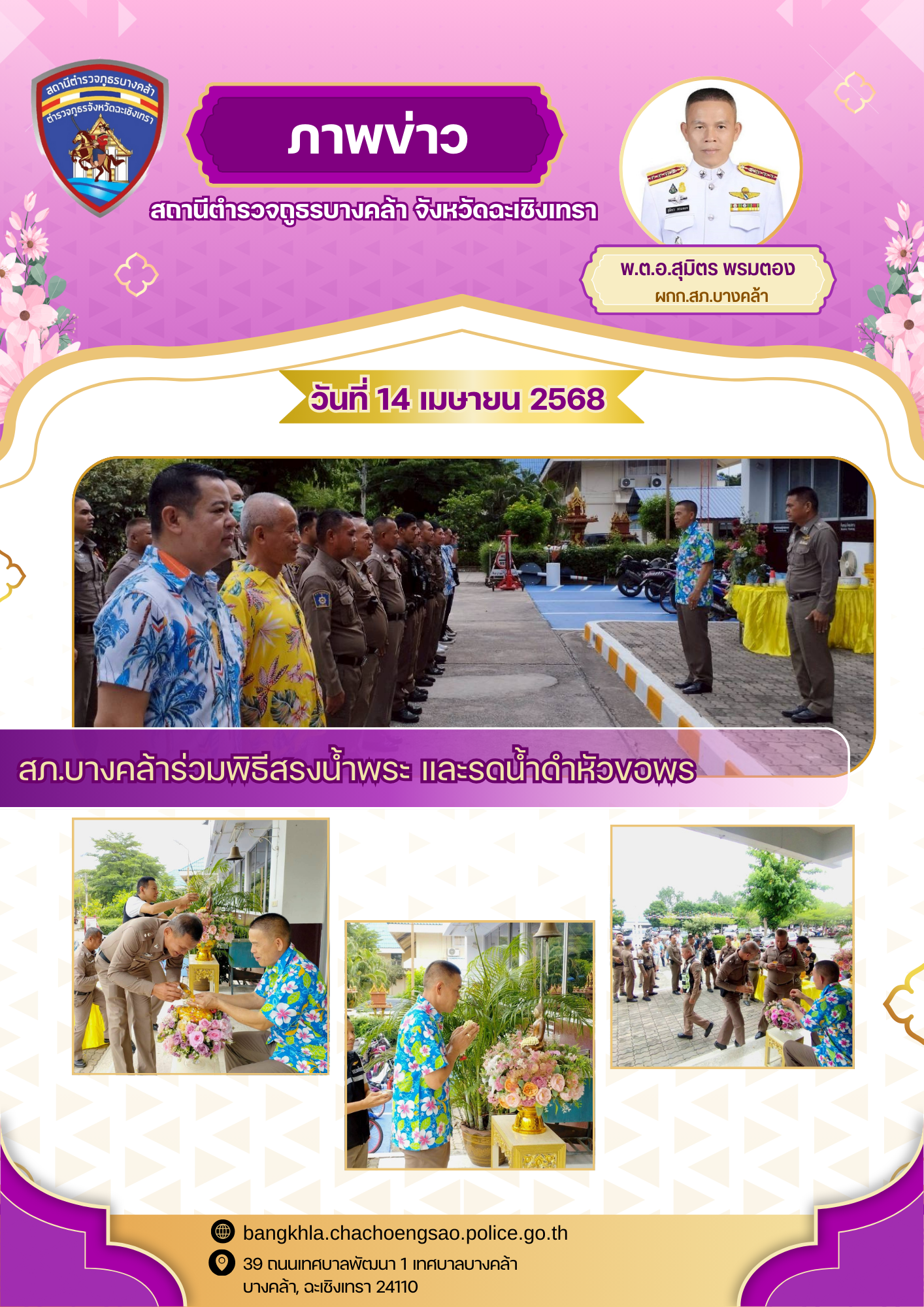 วันนี้ ที่ 14 เม.ย.68 เวลา 10.00 น. พ.ต.อ.สุมิตร พรมตอง ผกก.สภ.บางคล้า พร้อมข้าราชการตำรวจ