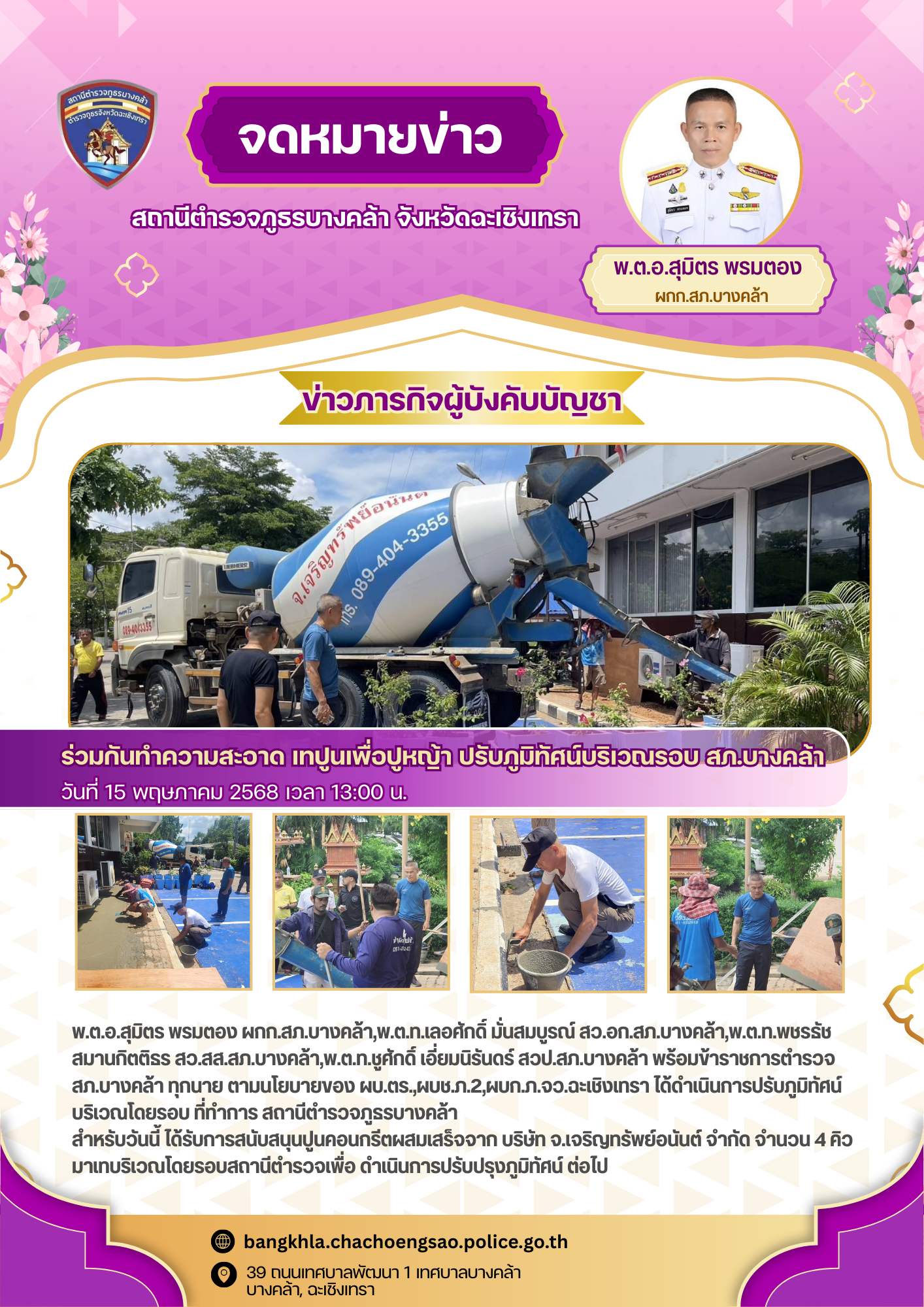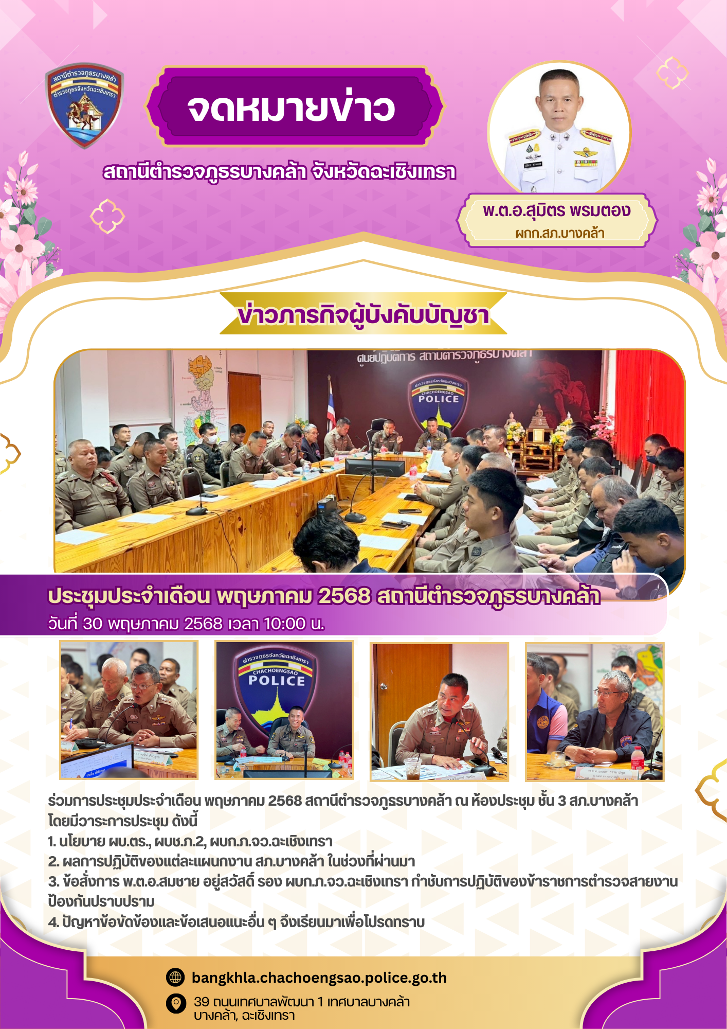 วันศุกร์ที่ 30 พฤษภาคม พ.ศ.2568 เวลา 10.00 น. – พ.ต.อ.สมชาย อยู่สวัสดิ์ รอง ผบก.ภ.จว.ฉะเชิงเทร