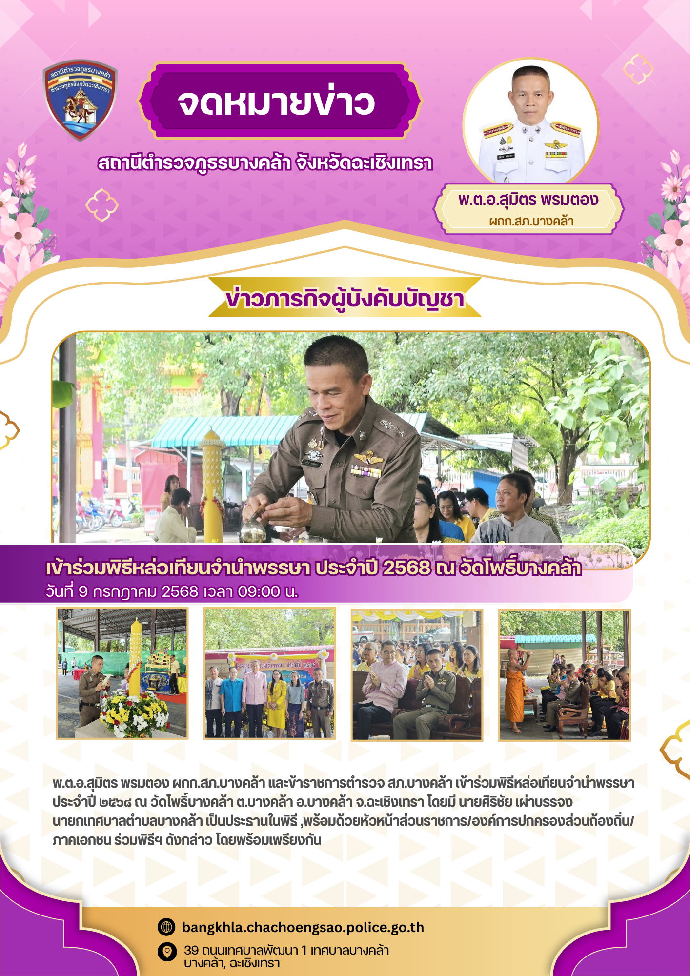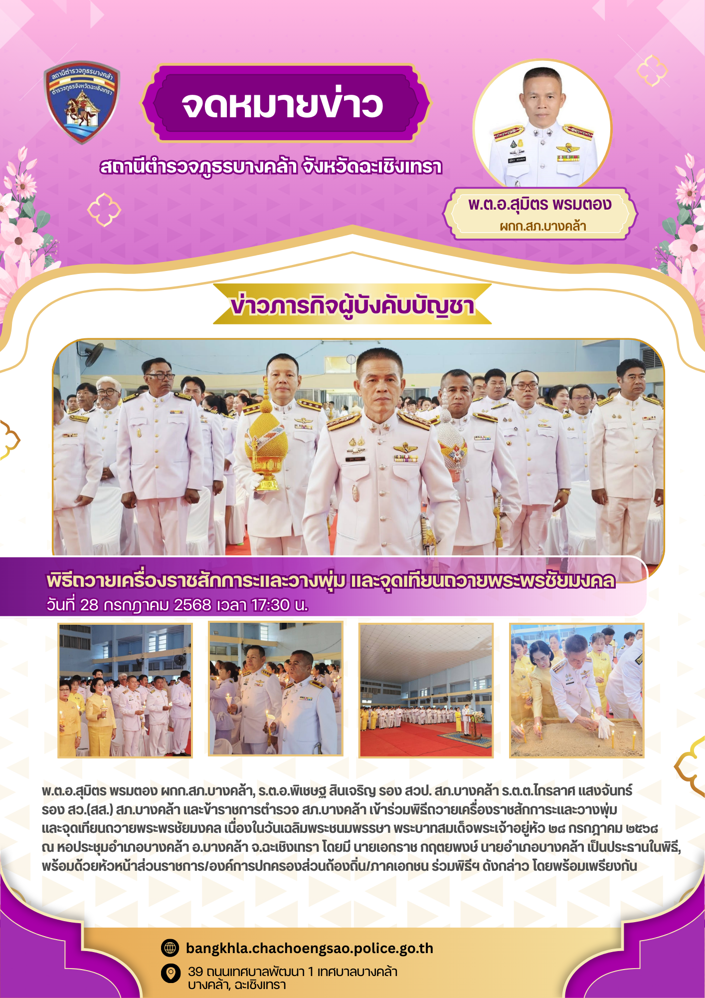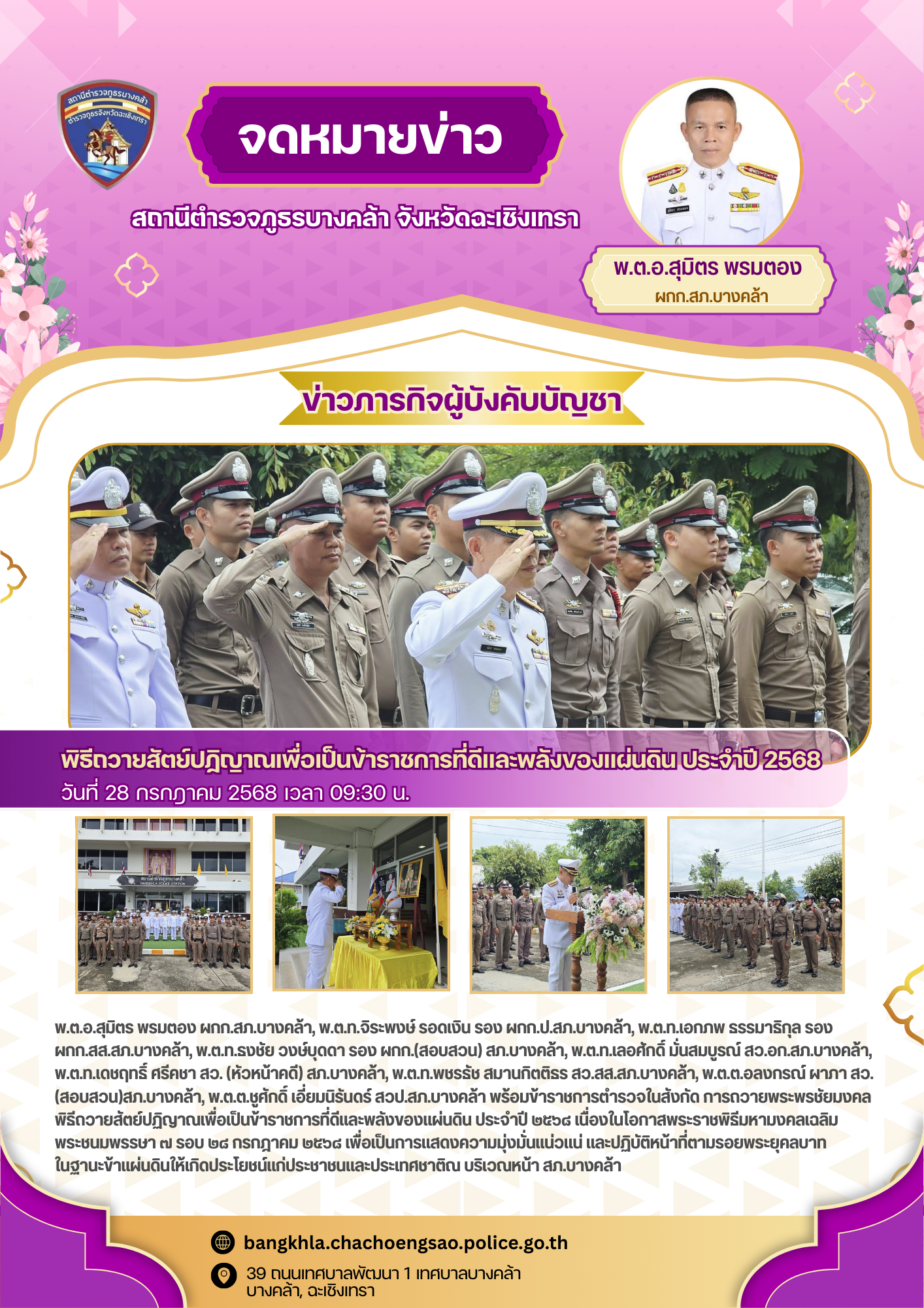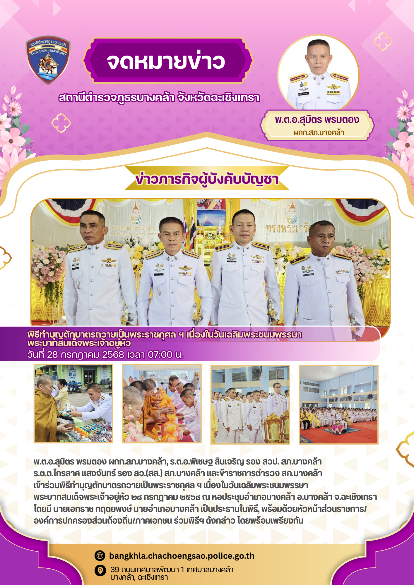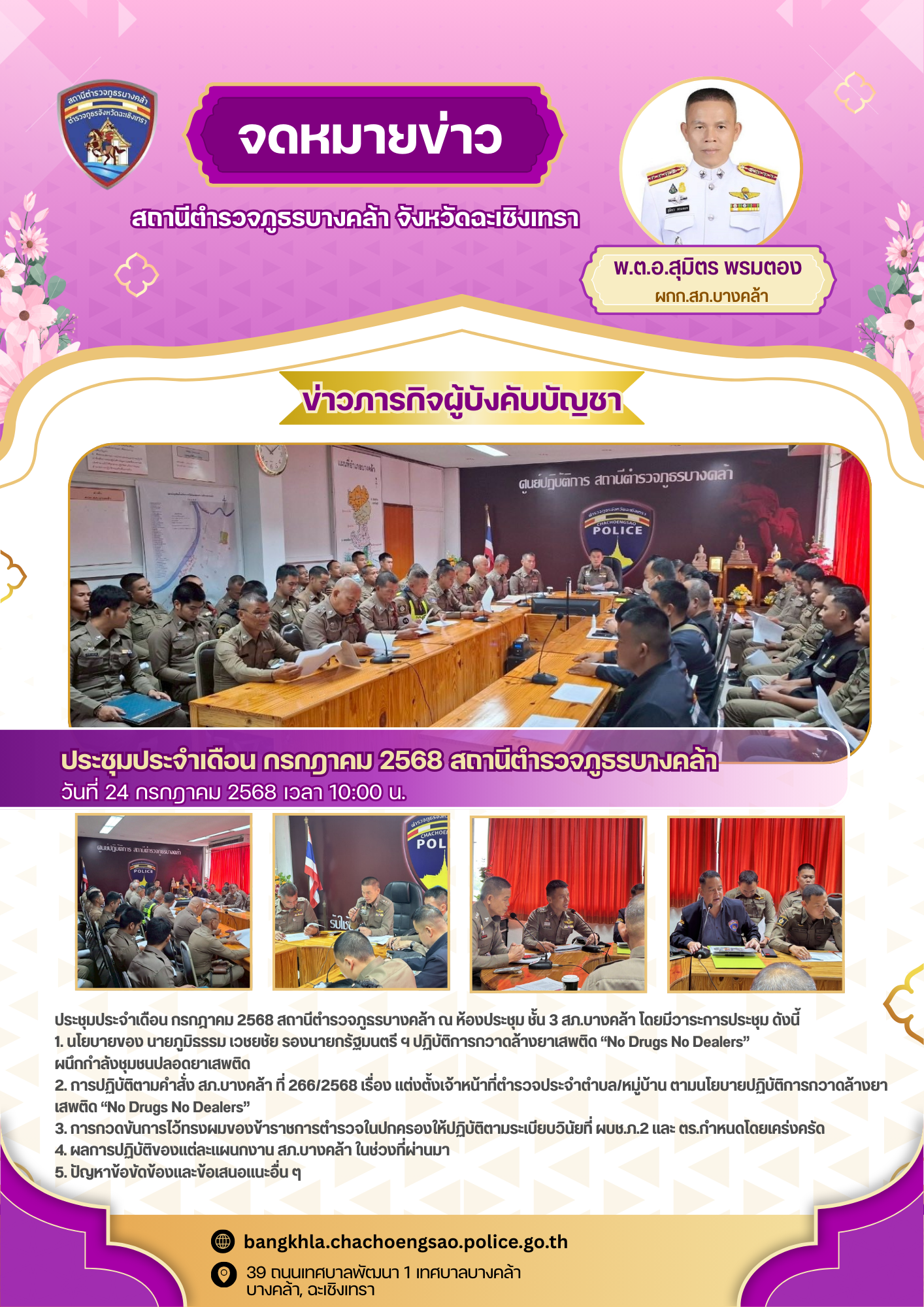 วันพฤหัสบดีที่ 24 กรกฎาคม พ.ศ.2568 เวลา 10.00 น. – พ.ต.อ.สุมิตร พรมตอง ผกก.สภ.บางคล้า –