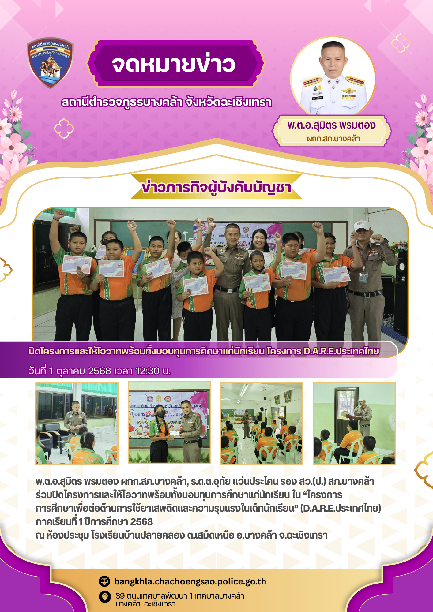 วันนี้ ( ๑ ต.ค.๒๕๖๘ ) เวลา ๑๒.๓๐ น. – พ.ต.อ.สุมิตร พรมตอง ผกก.สภ.บางคล้า, – ร.ต.ต.อุทัย