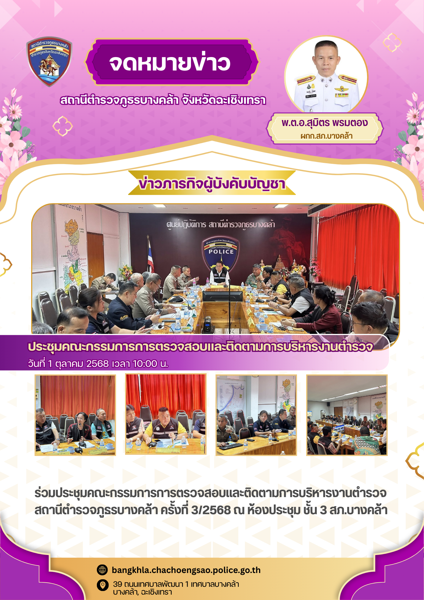 วันพุธที่ 1 ตุลาคม พ.ศ.2568 เวลา 10.00 น. นายศิริชัย เผ่าบรรจง นายกเทศบาลตำบลบางคล้า (ประธาน กต.ตร.ส