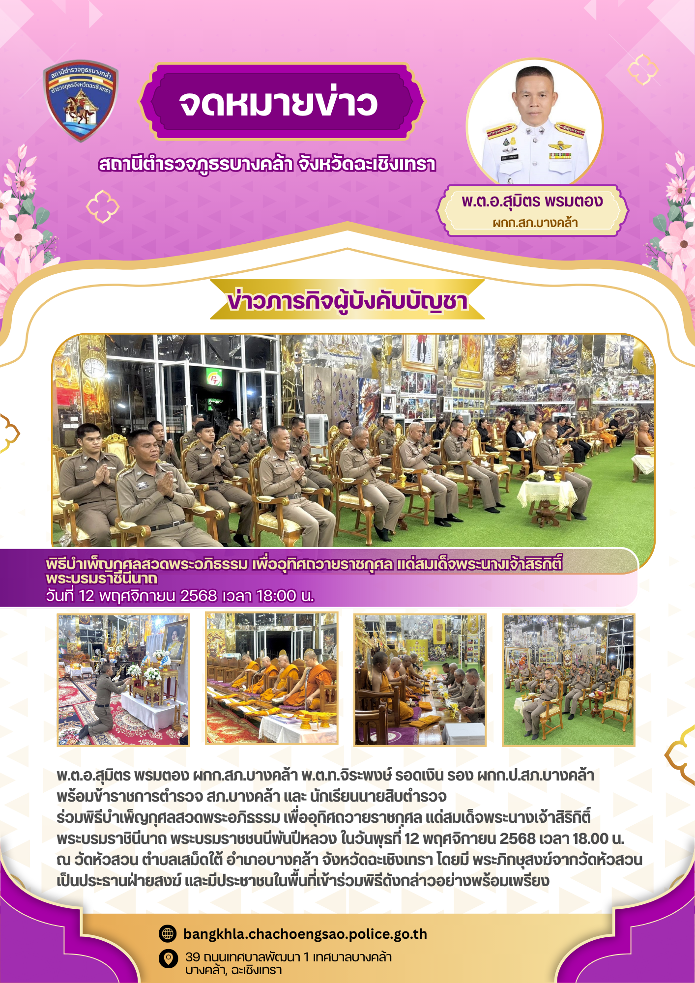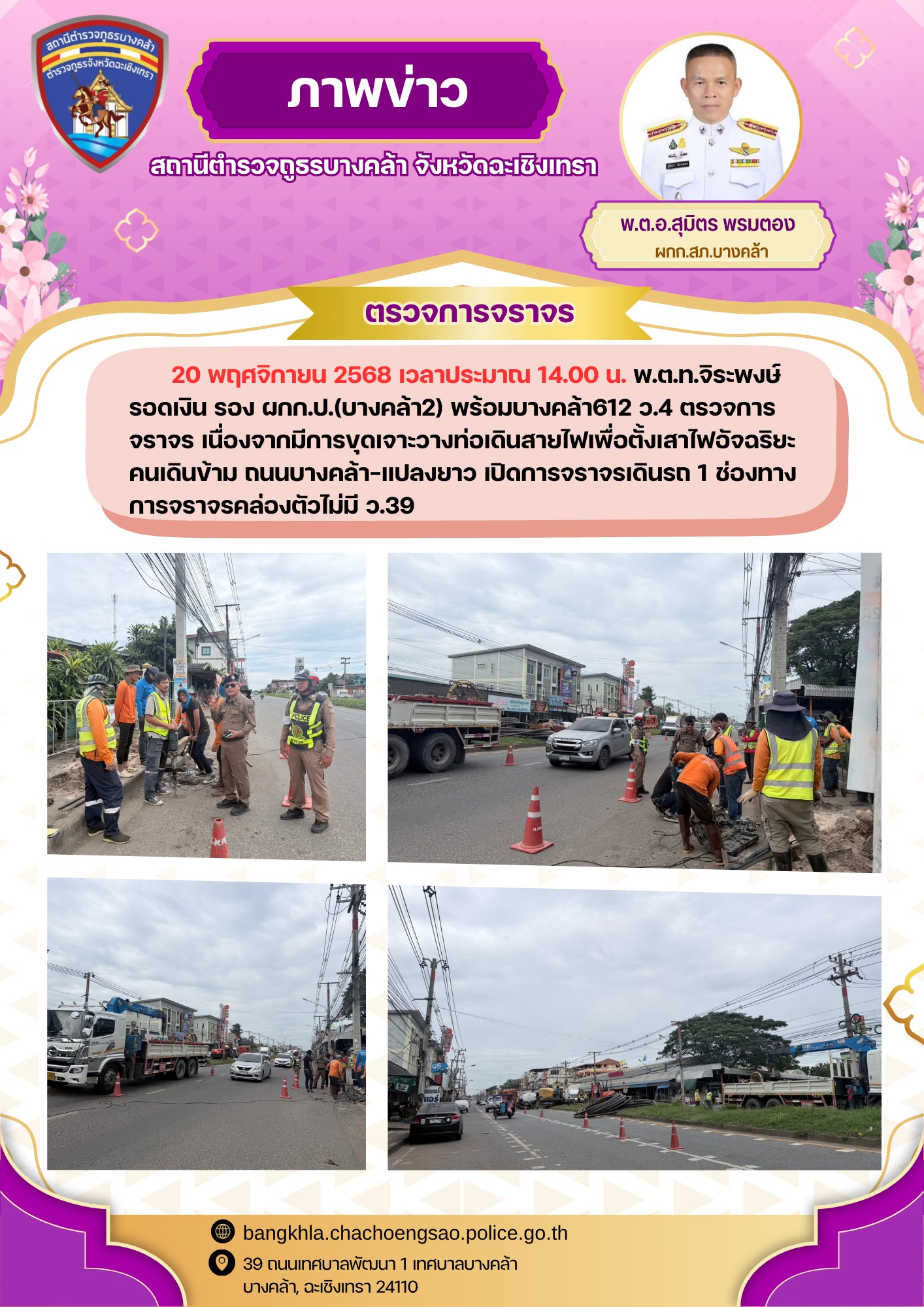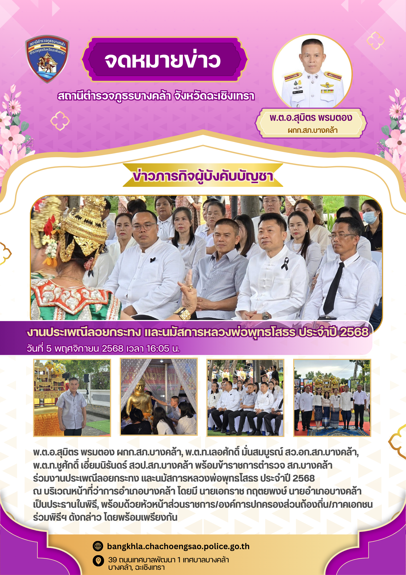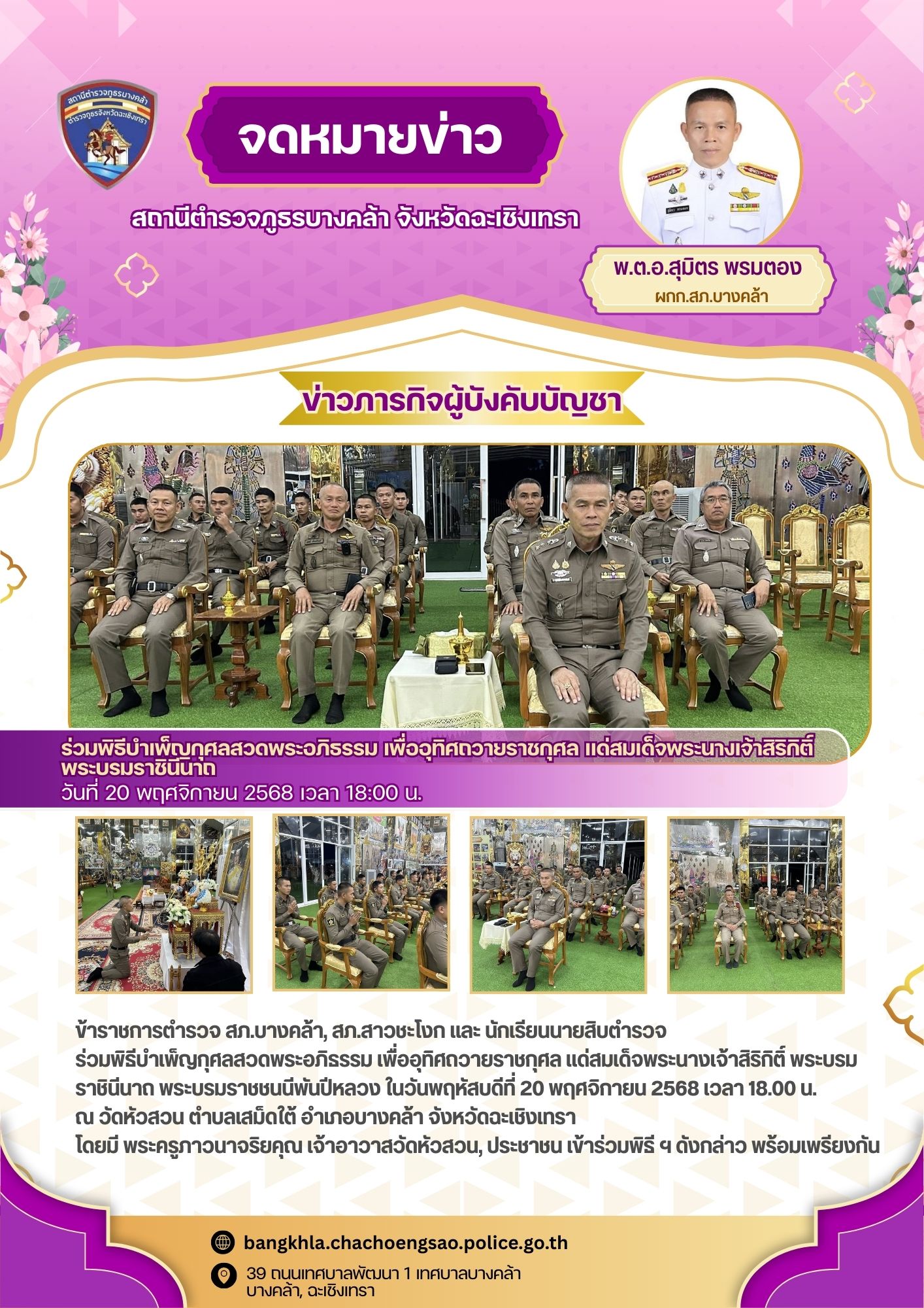 วันพฤหัสบดีที่ 20 พฤศจิกายน 2568 เวลา 18.00 น. – พ.ต.อ.สุมิตร พรมตอง ผกก.สภ.บางคล้า – พ.